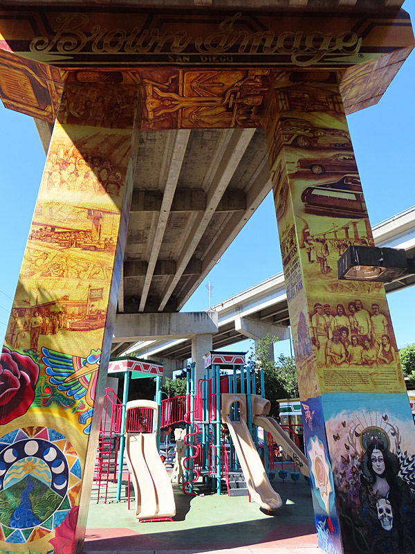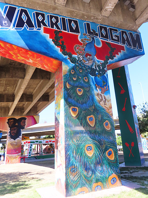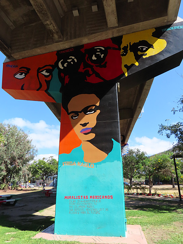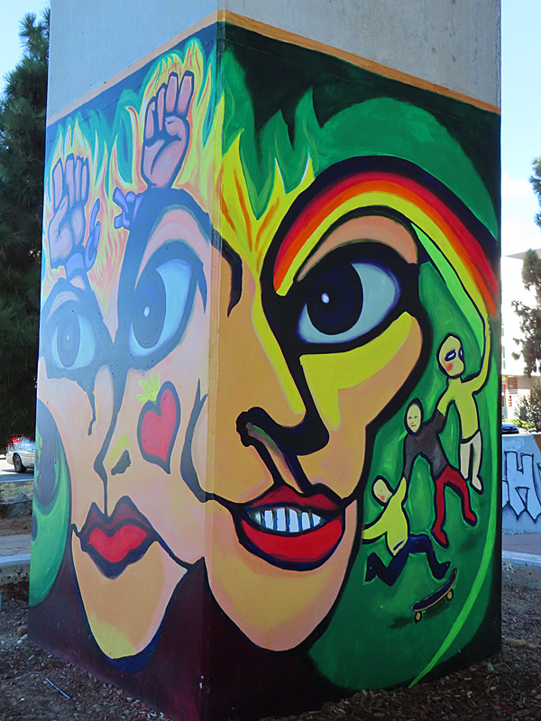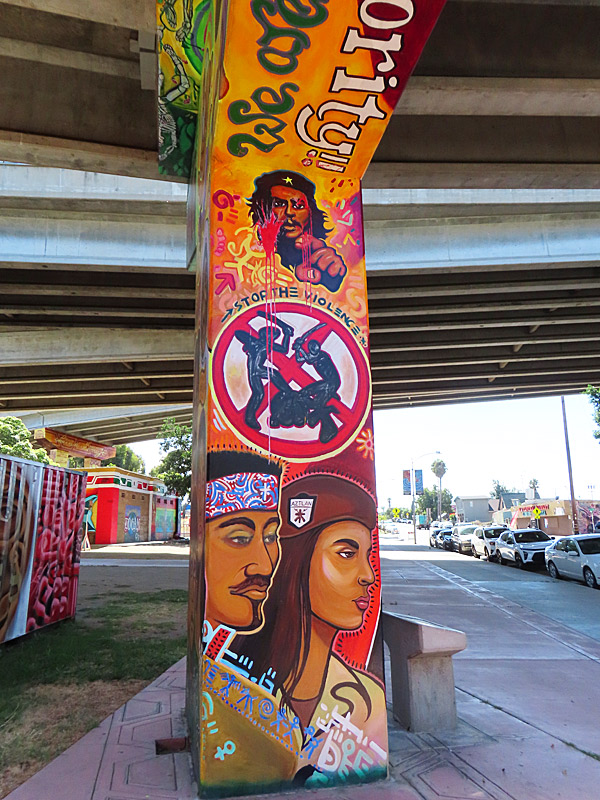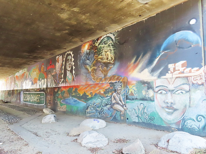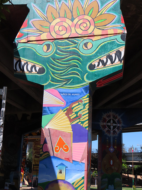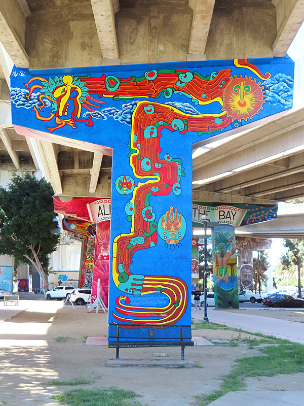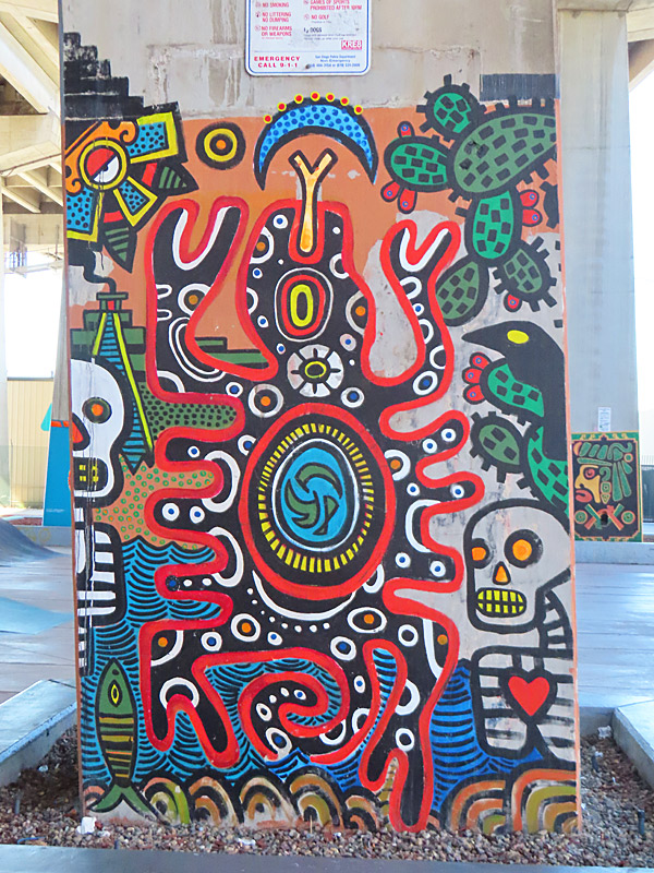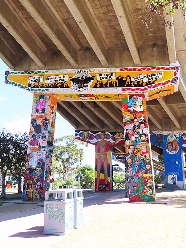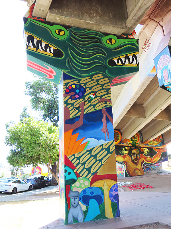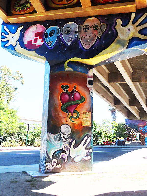 Most of the murals are painted on the infrastructure of a major highway interchange where Interstate 5 meets the road to the Balboa Bridge. Because of that, many of the surfaces are not proper rectangles. It’s interesting to see how the artists work with some odd angles and bridge supports that often are not exactly vertical or horizontal. Some of the murals are even painted on the bottom of the highway – or the ceiling of the park depending on how you look at it.