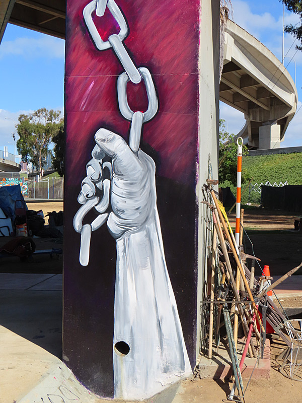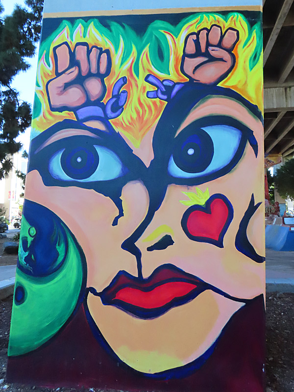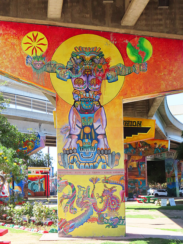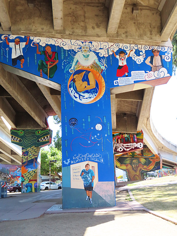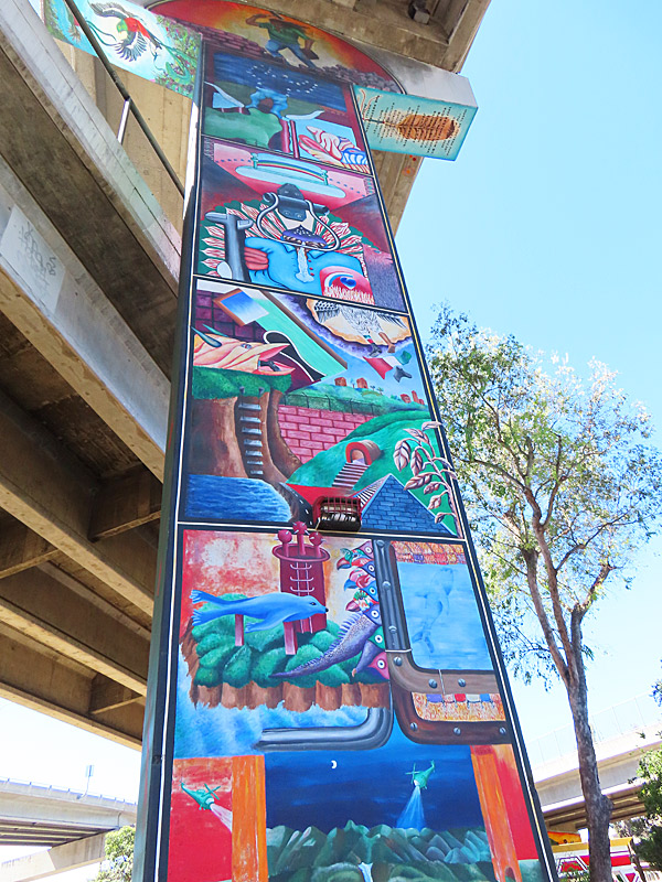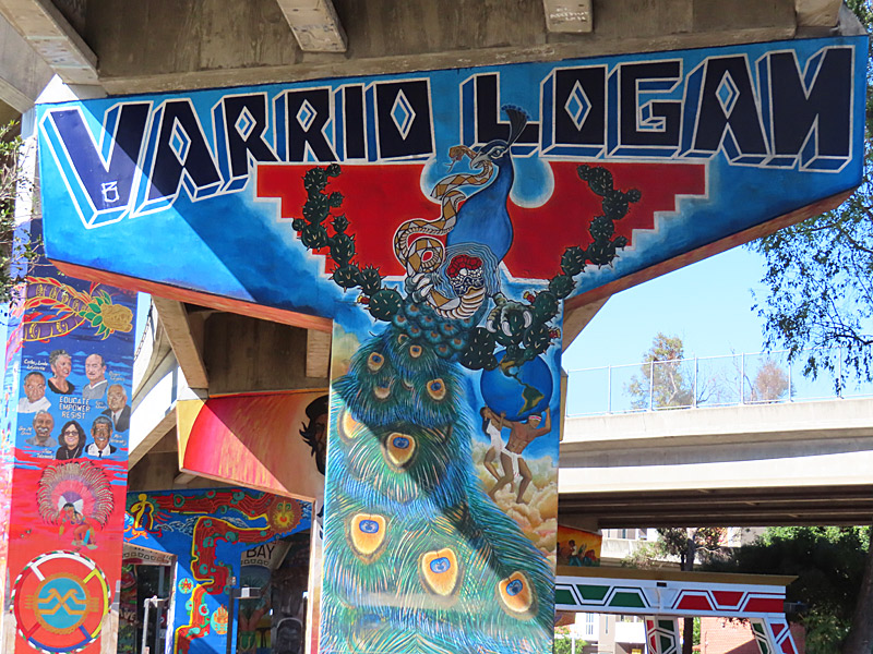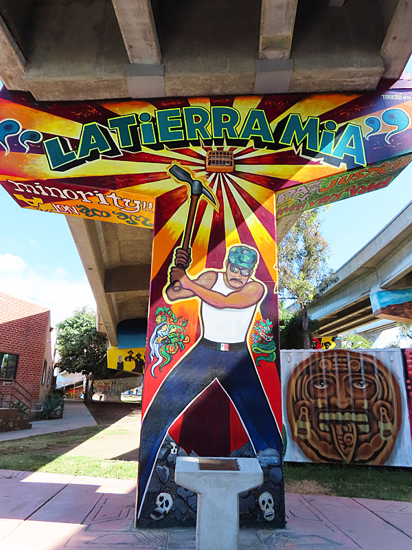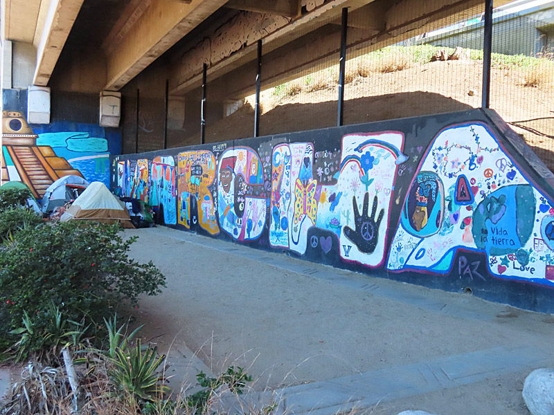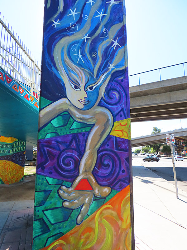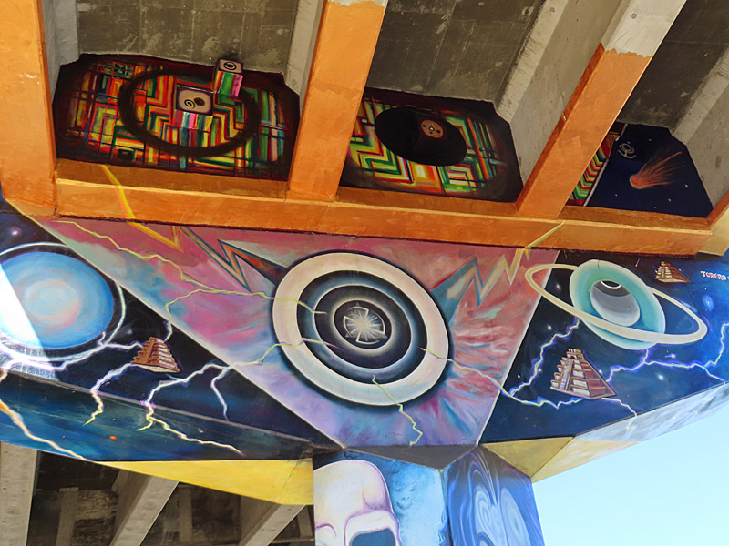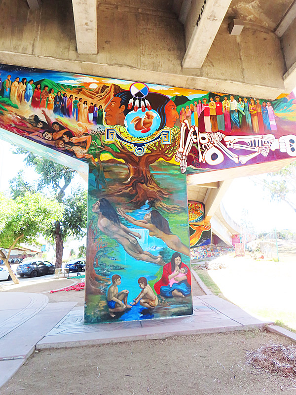 Most of the murals are painted on the infrastructure of a major highway interchange where Interstate 5 meets the road to the Balboa Bridge. Because of that, many of the surfaces are not proper rectangles. It’s interesting to see how the artists work with some odd angles and bridge supports that often are not exactly vertical or horizontal. Some of the murals are even painted on the bottom of the highway – or the ceiling of the park depending on how you look at it.