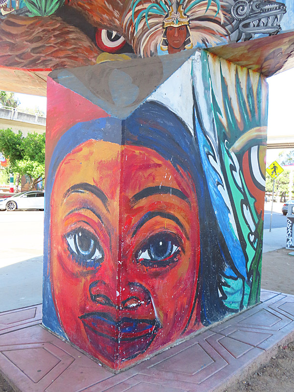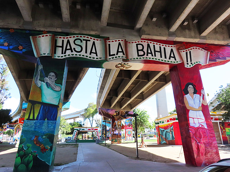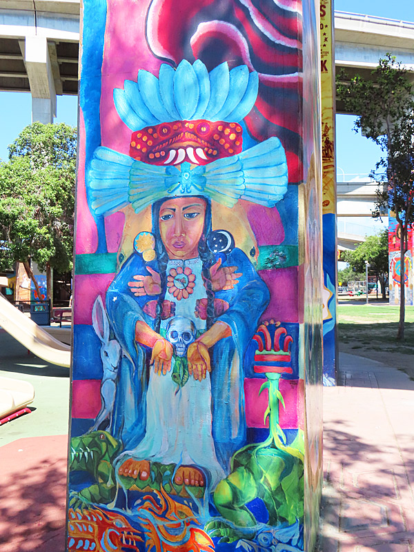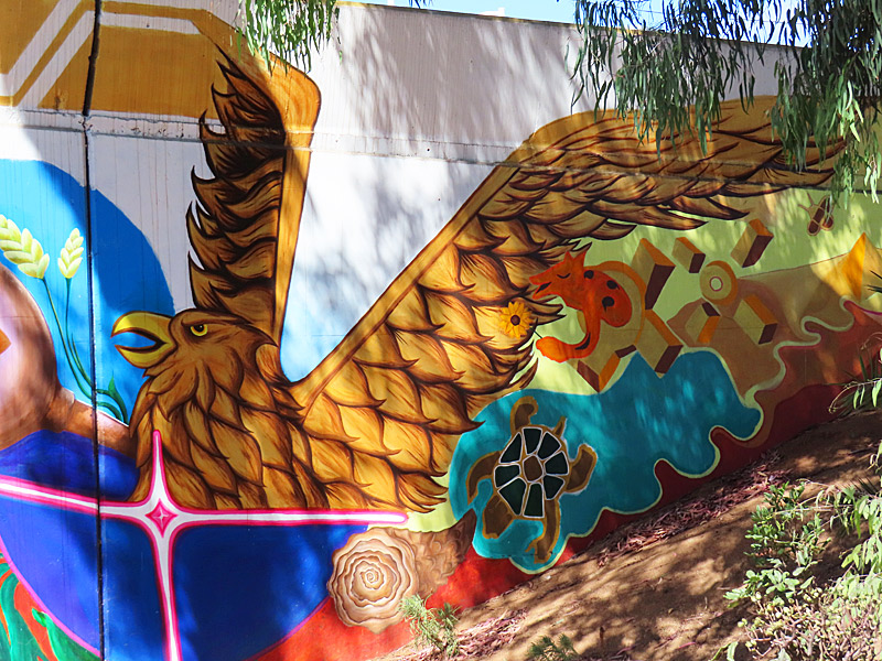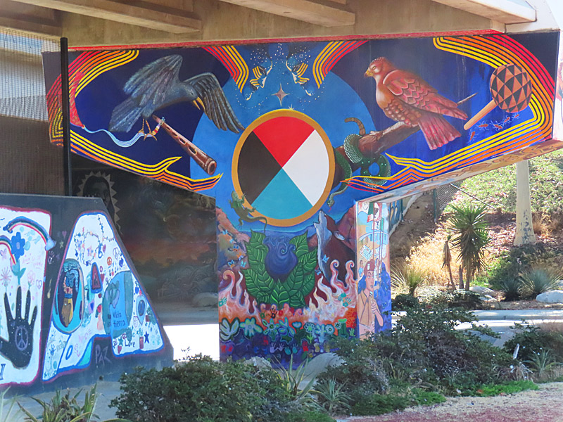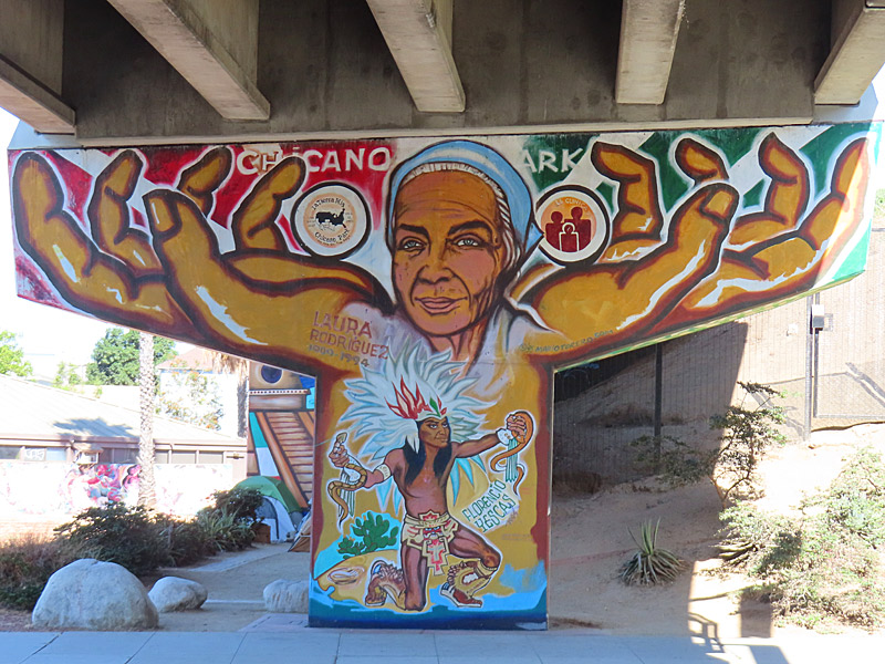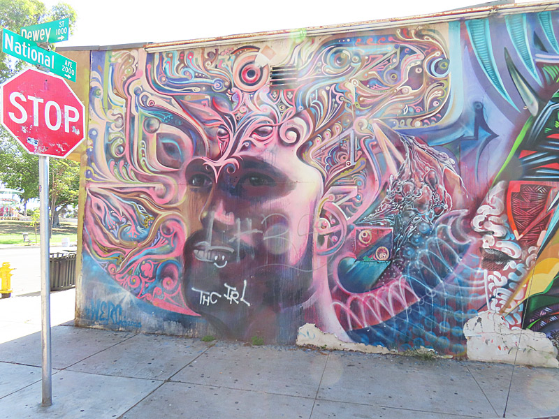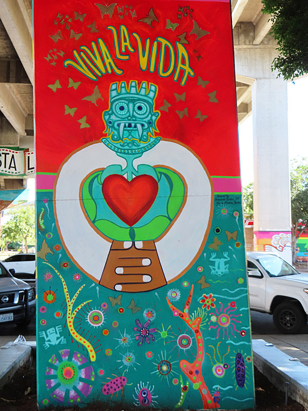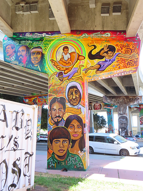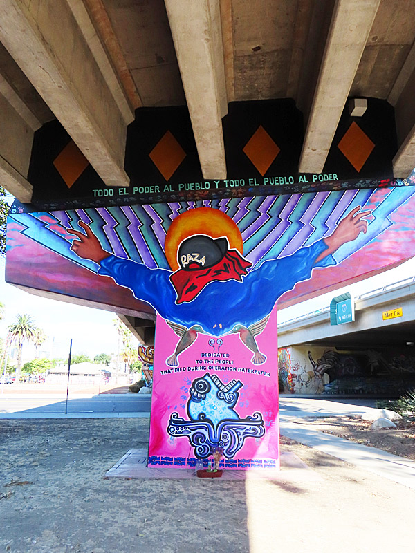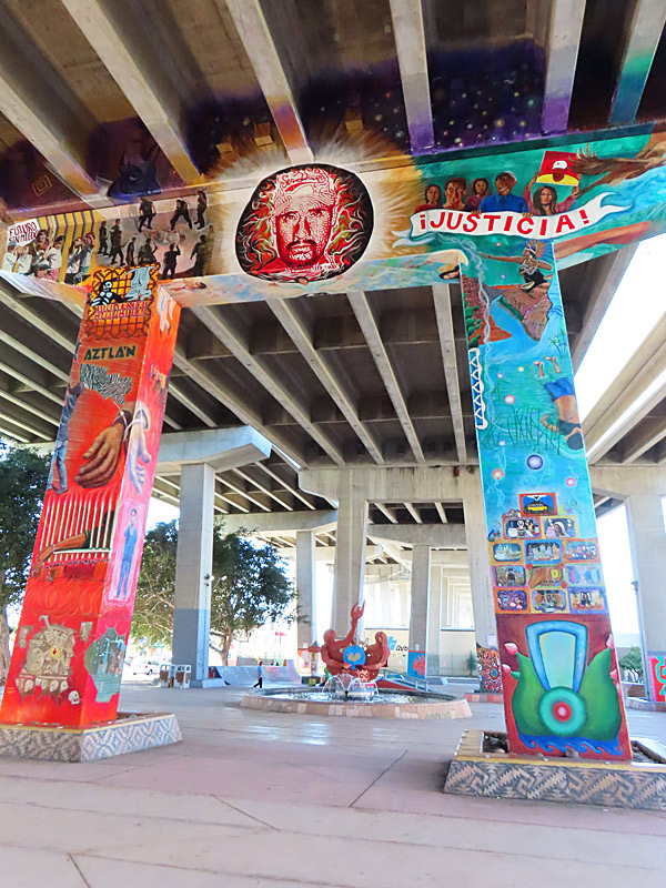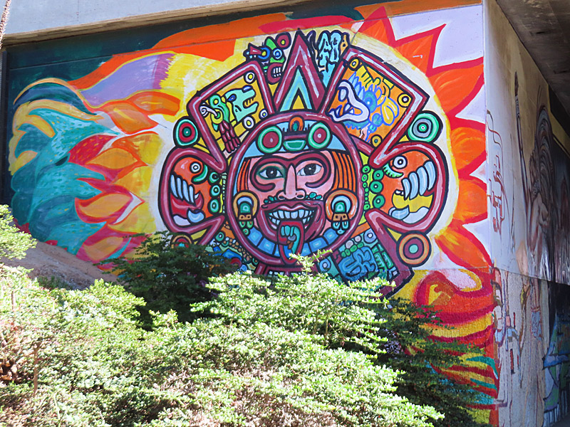 Most of the murals are painted on the infrastructure of a major highway interchange where Interstate 5 meets the road to the Balboa Bridge. Because of that, many of the surfaces are not proper rectangles. It’s interesting to see how the artists work with some odd angles and bridge supports that often are not exactly vertical or horizontal. Some of the murals are even painted on the bottom of the highway – or the ceiling of the park depending on how you look at it.