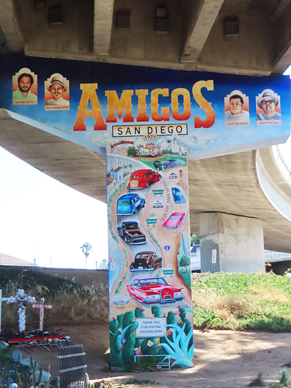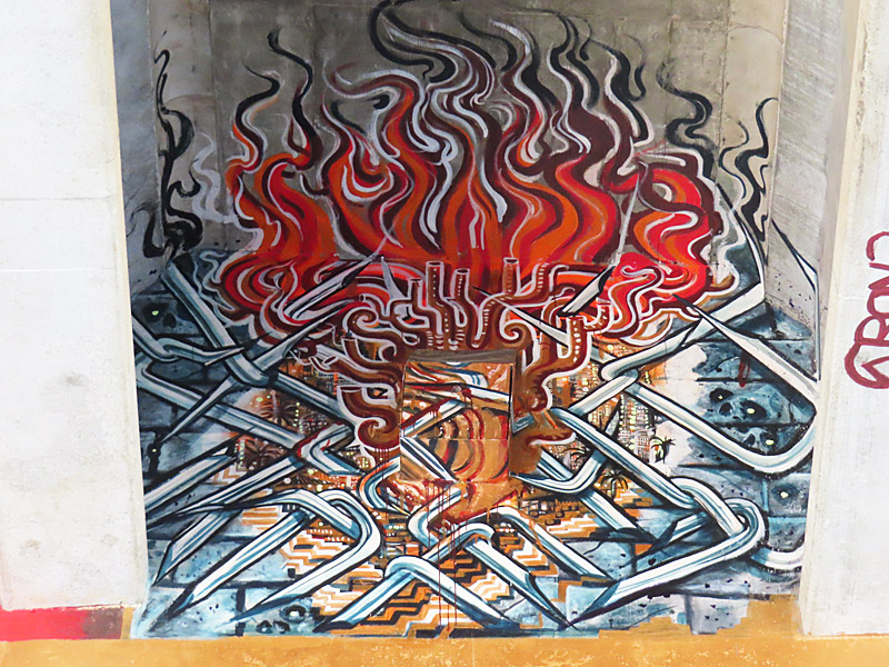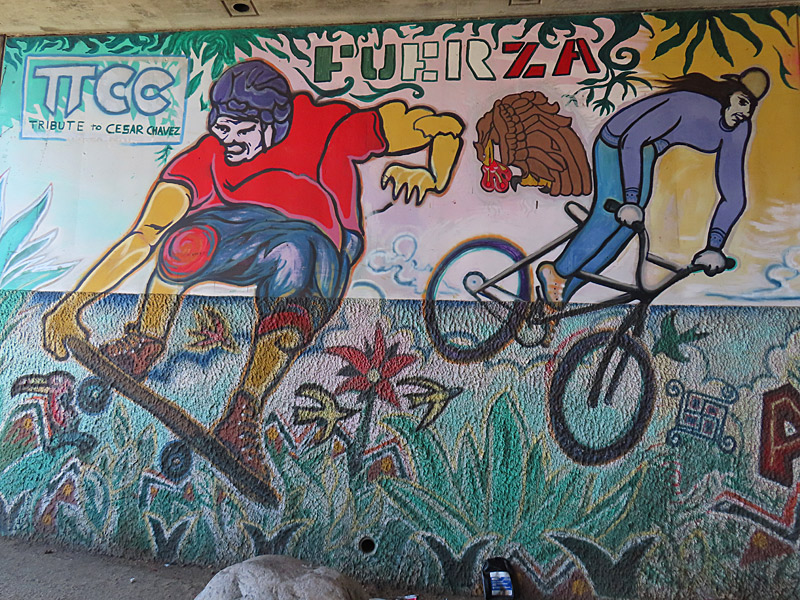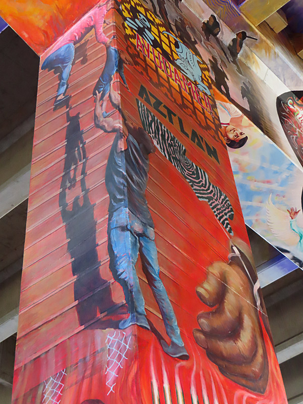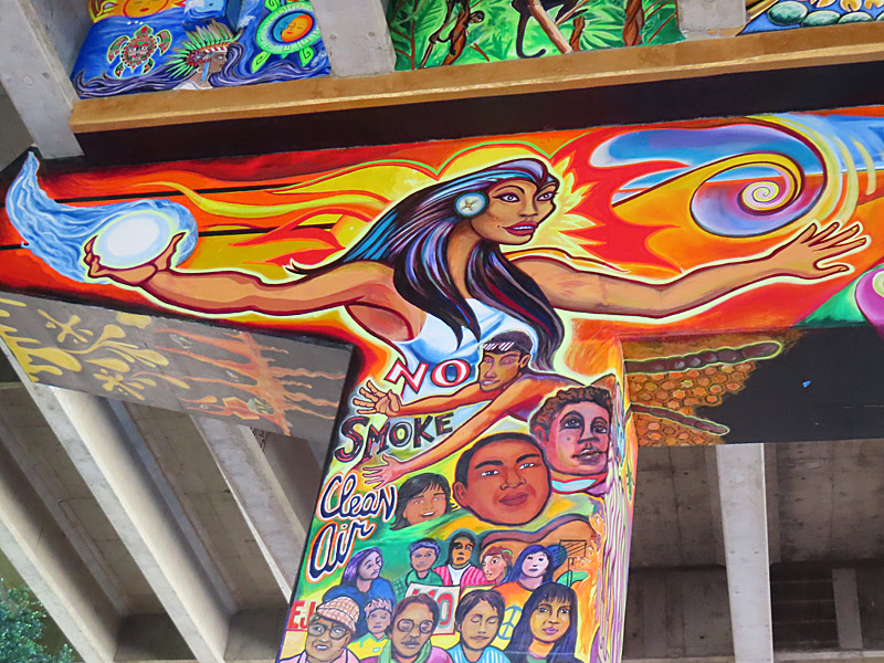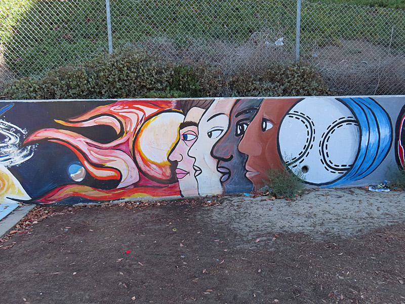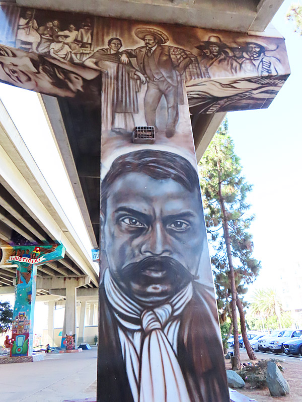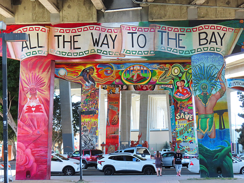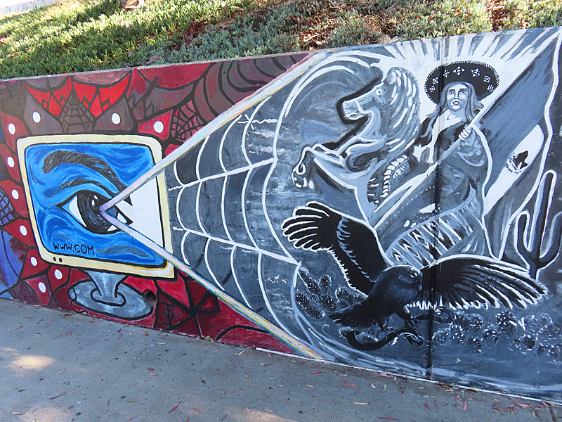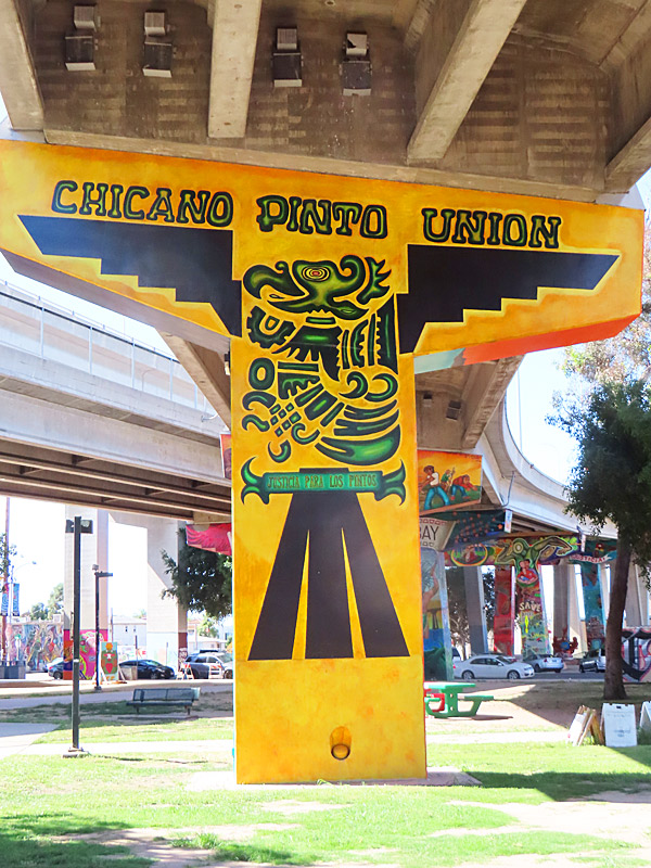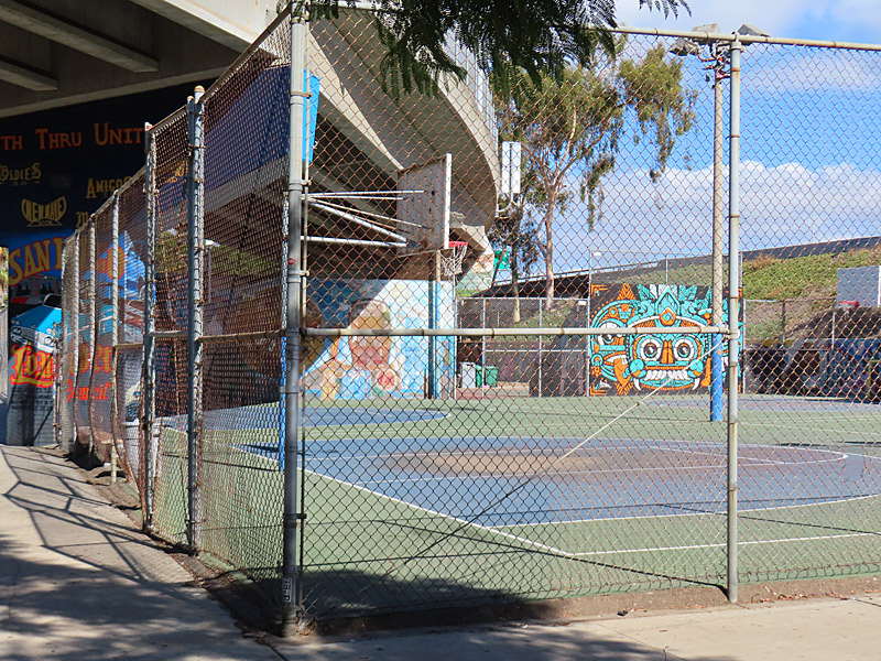 Most of the murals are painted on the infrastructure of a major highway interchange where Interstate 5 meets the road to the Balboa Bridge. Because of that, many of the surfaces are not proper rectangles. It’s interesting to see how the artists work with some odd angles and bridge supports that often are not exactly vertical or horizontal. Some of the murals are even painted on the bottom of the highway – or the ceiling of the park depending on how you look at it.
