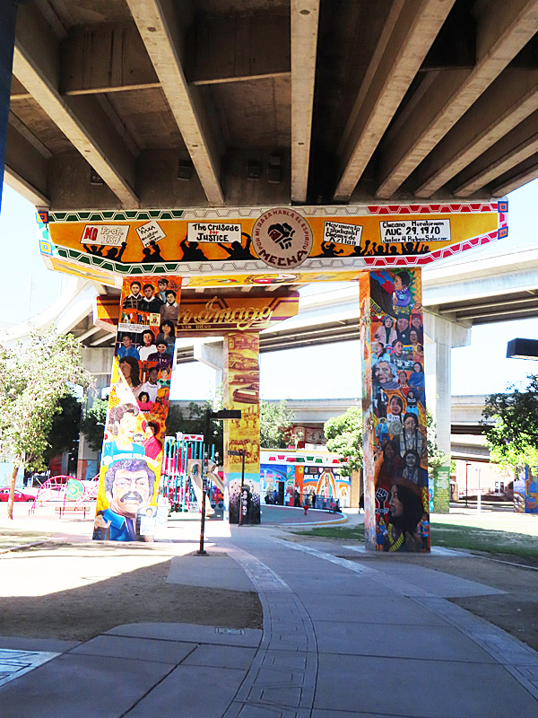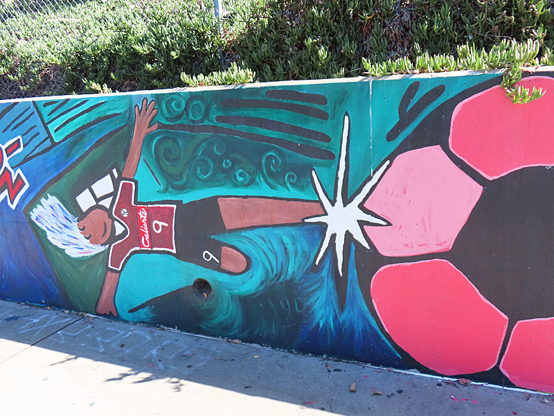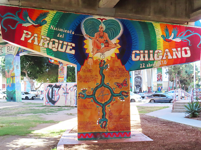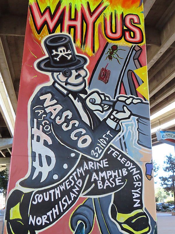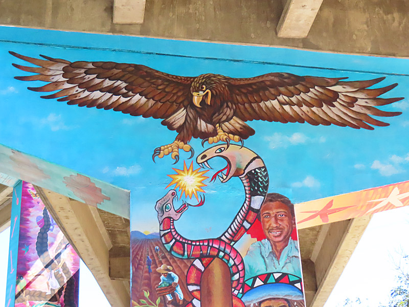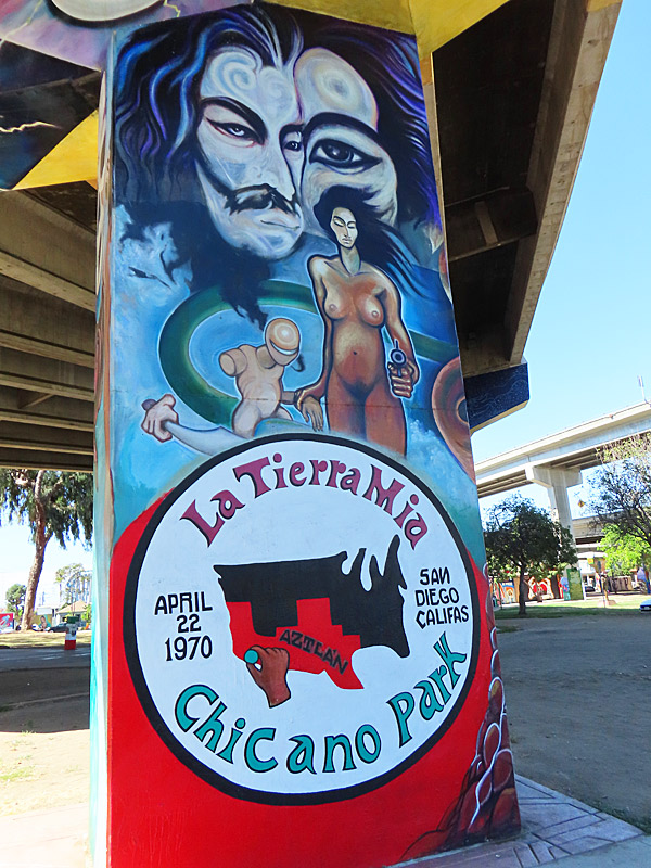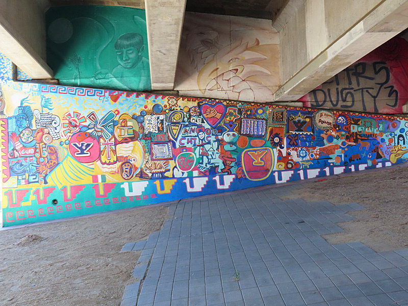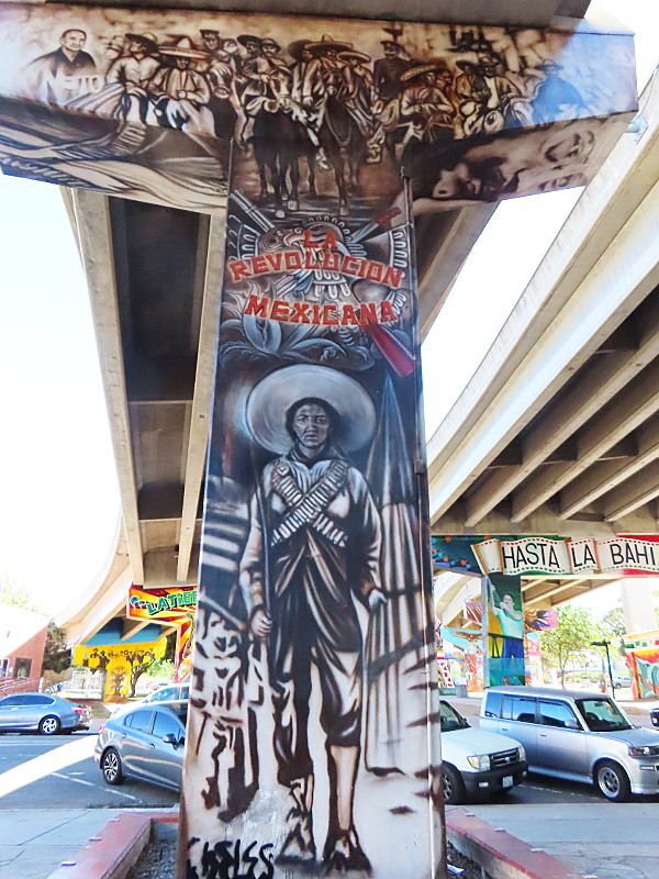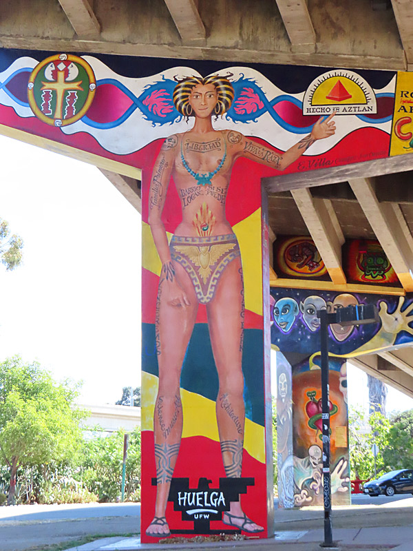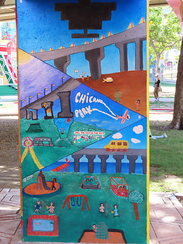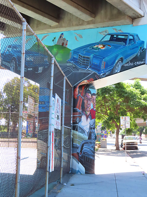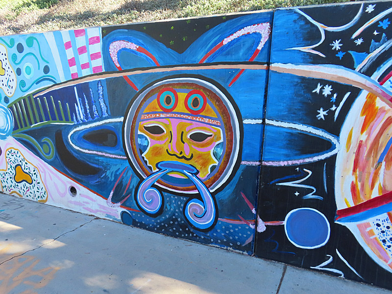 Most of the murals are painted on the infrastructure of a major highway interchange where Interstate 5 meets the road to the Balboa Bridge. Because of that, many of the surfaces are not proper rectangles. It’s interesting to see how the artists work with some odd angles and bridge supports that often are not exactly vertical or horizontal. Some of the murals are even painted on the bottom of the highway – or the ceiling of the park depending on how you look at it.