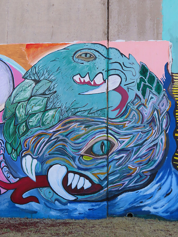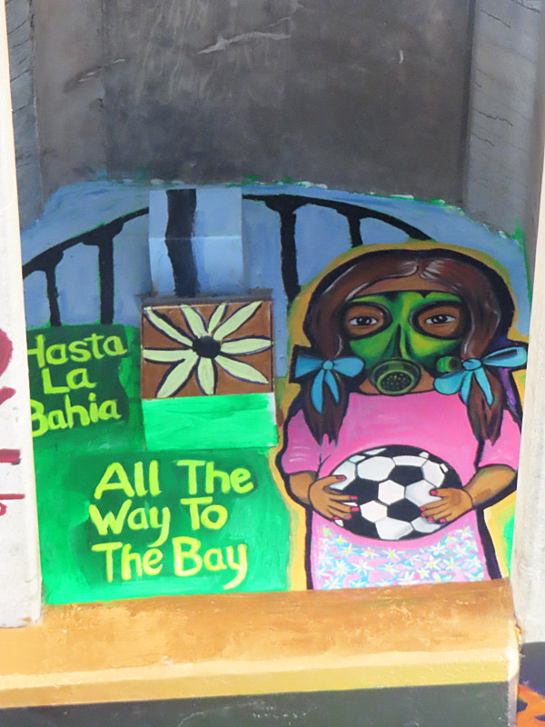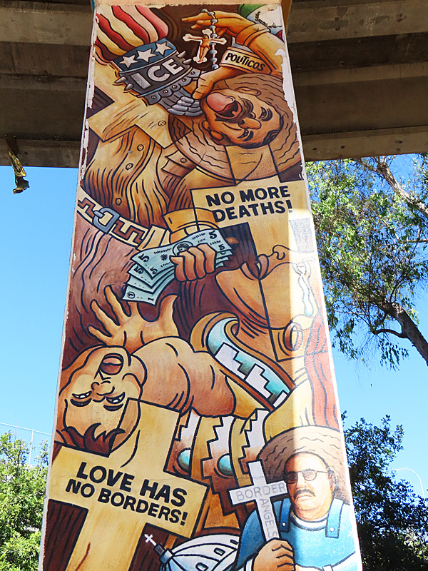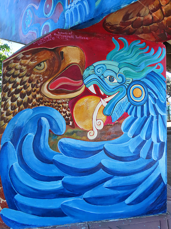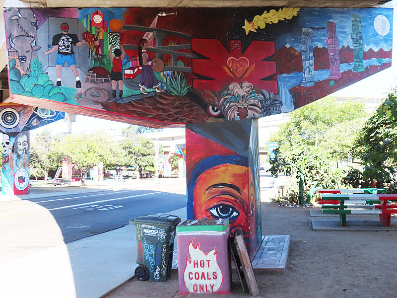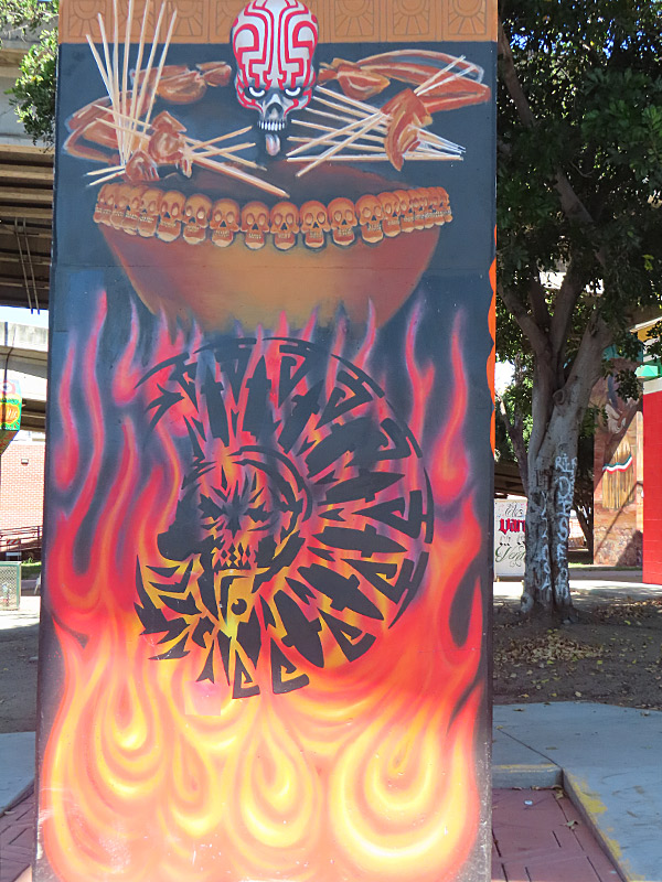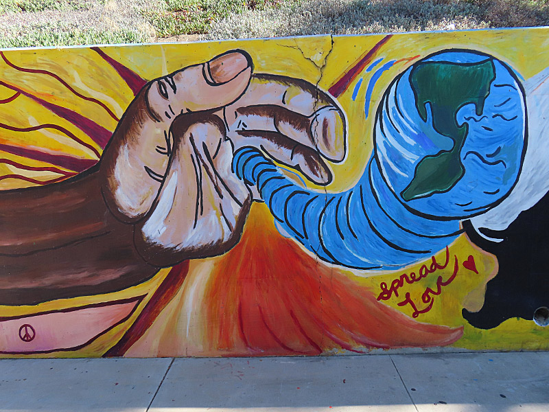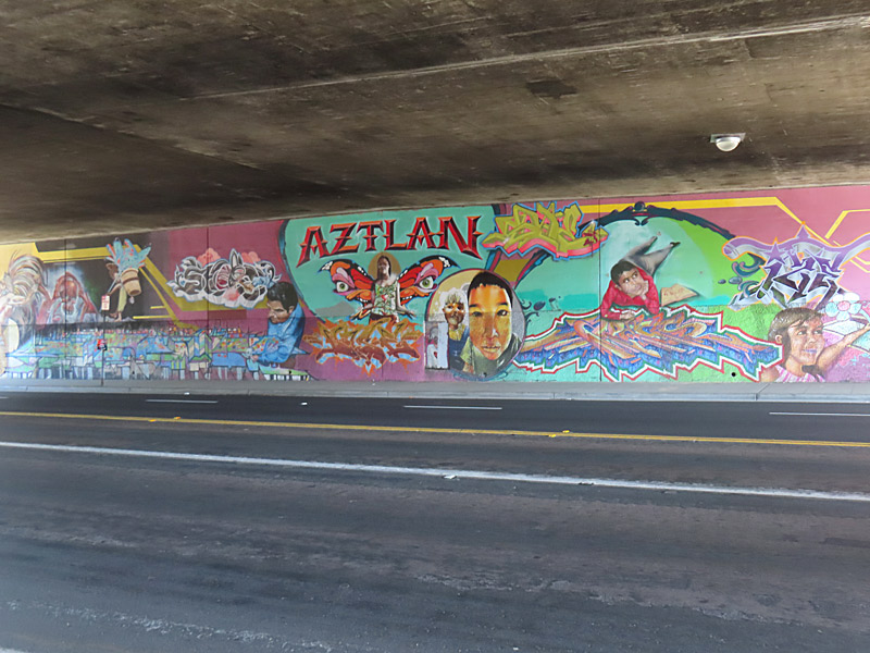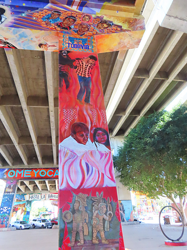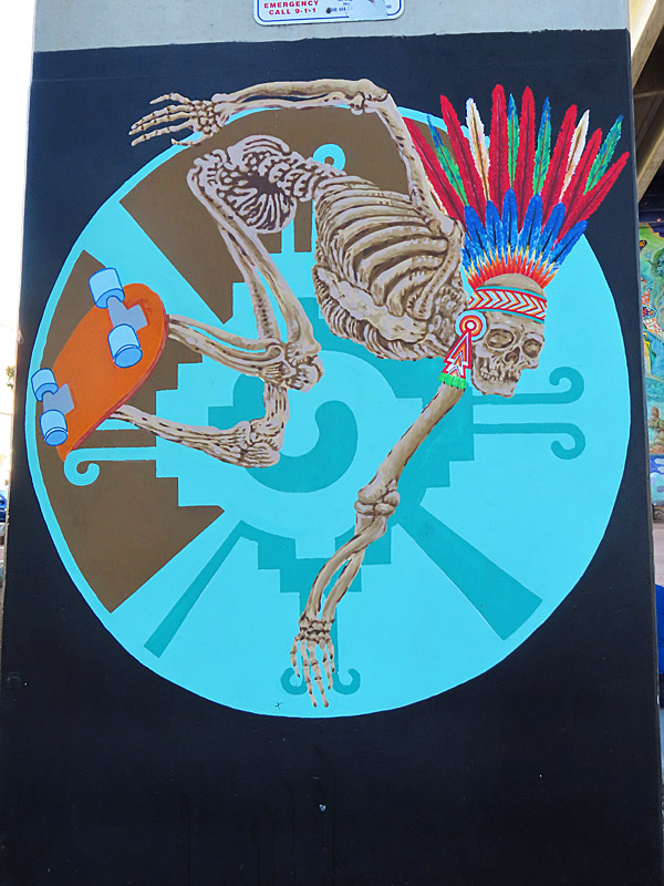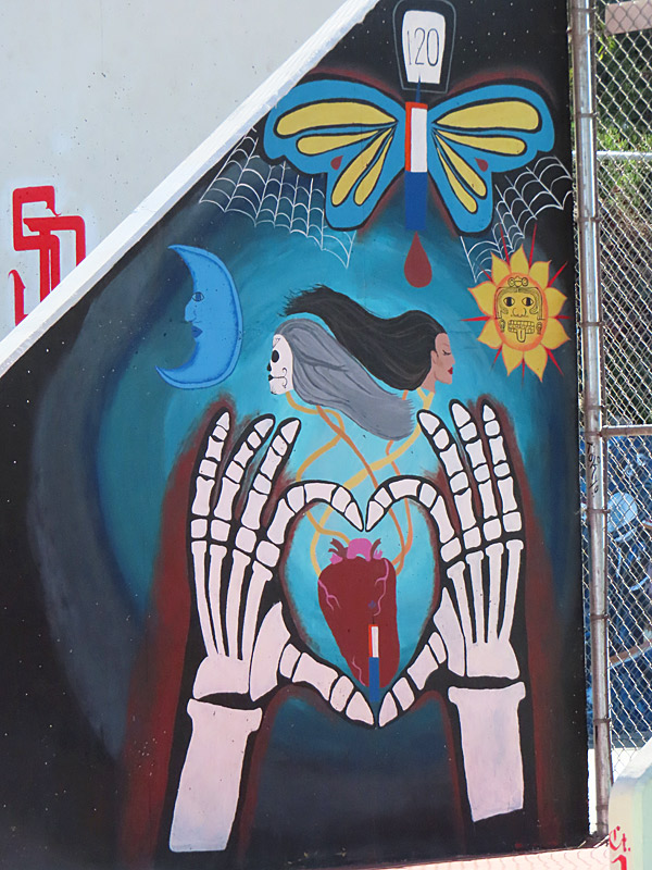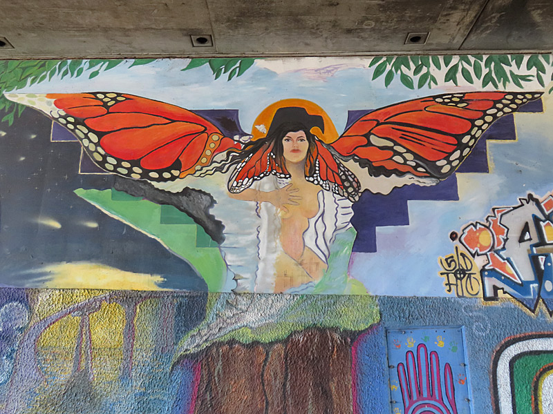 Most of the murals are painted on the infrastructure of a major highway interchange where Interstate 5 meets the road to the Balboa Bridge. Because of that, many of the surfaces are not proper rectangles. It’s interesting to see how the artists work with some odd angles and bridge supports that often are not exactly vertical or horizontal. Some of the murals are even painted on the bottom of the highway – or the ceiling of the park depending on how you look at it.