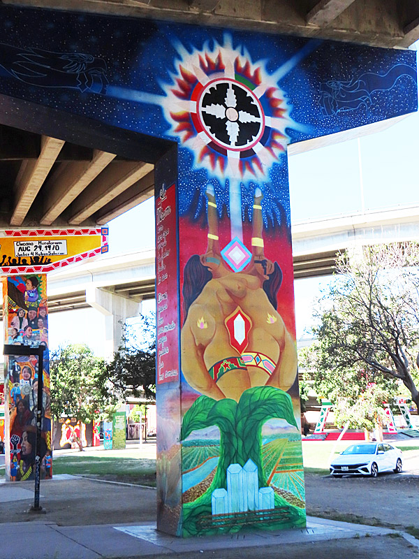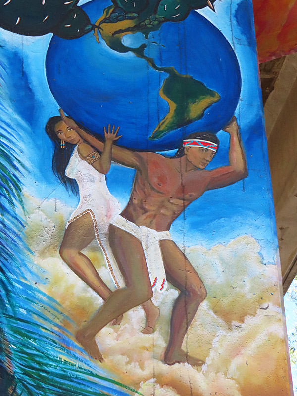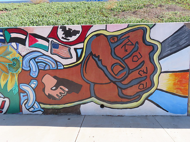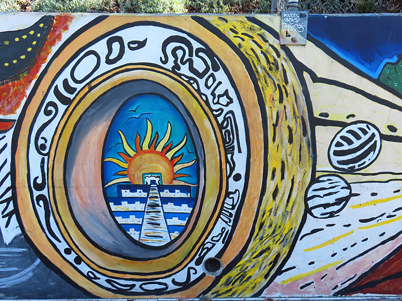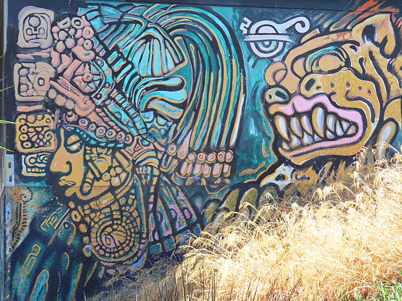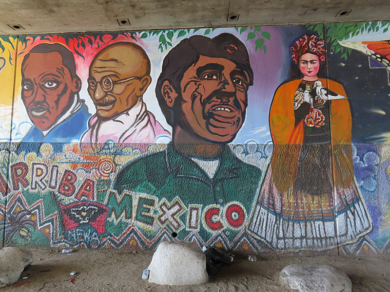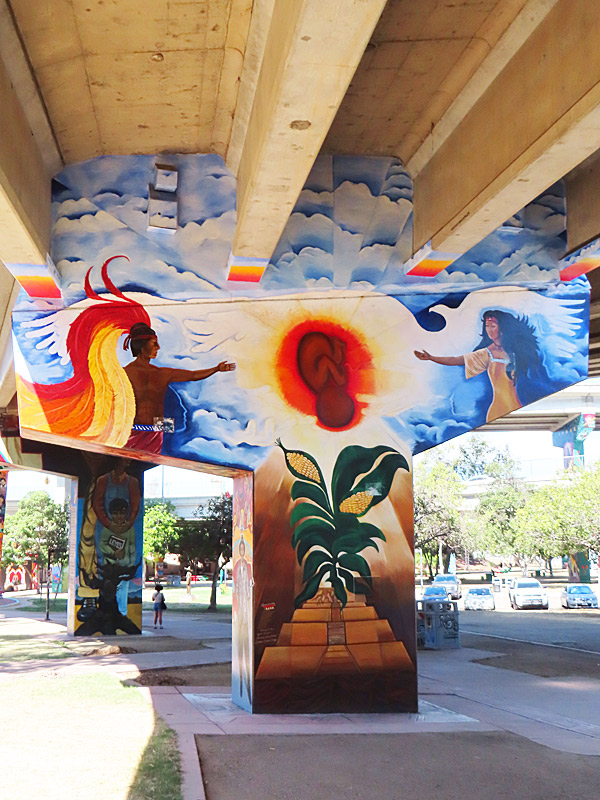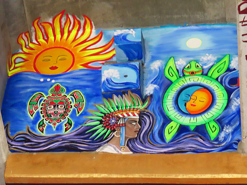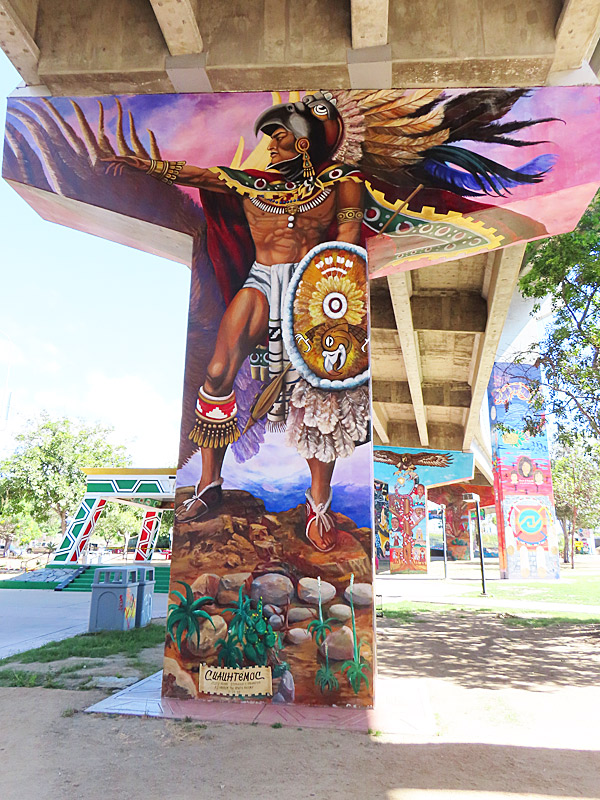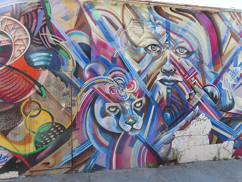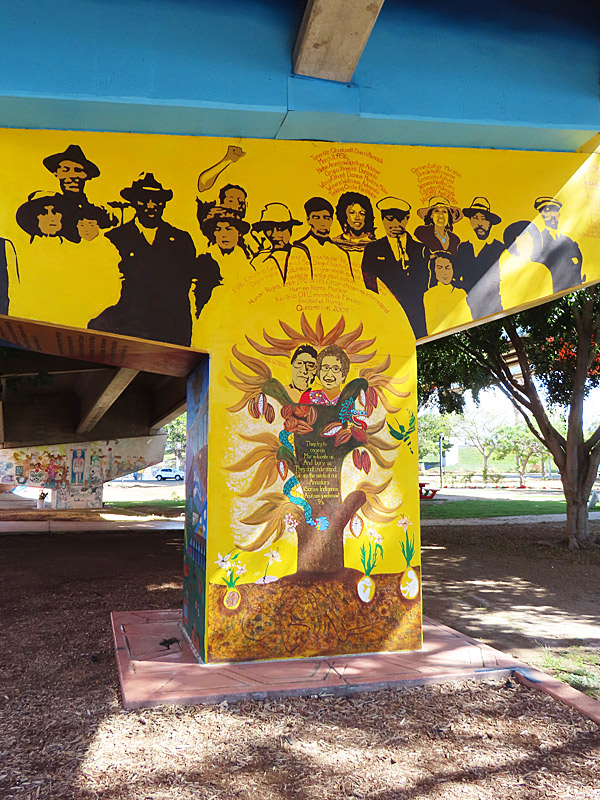 Most of the murals are painted on the infrastructure of a major highway interchange where Interstate 5 meets the road to the Balboa Bridge. Because of that, many of the surfaces are not proper rectangles. It’s interesting to see how the artists work with some odd angles and bridge supports that often are not exactly vertical or horizontal. Some of the murals are even painted on the bottom of the highway – or the ceiling of the park depending on how you look at it.
