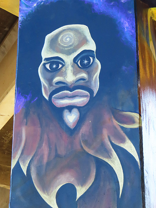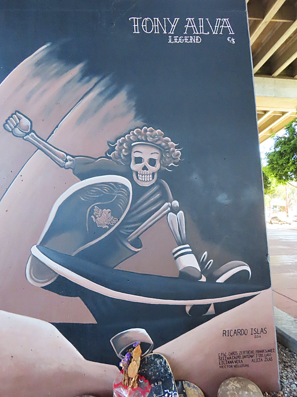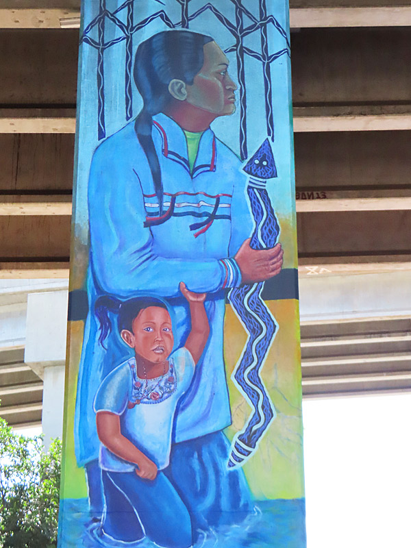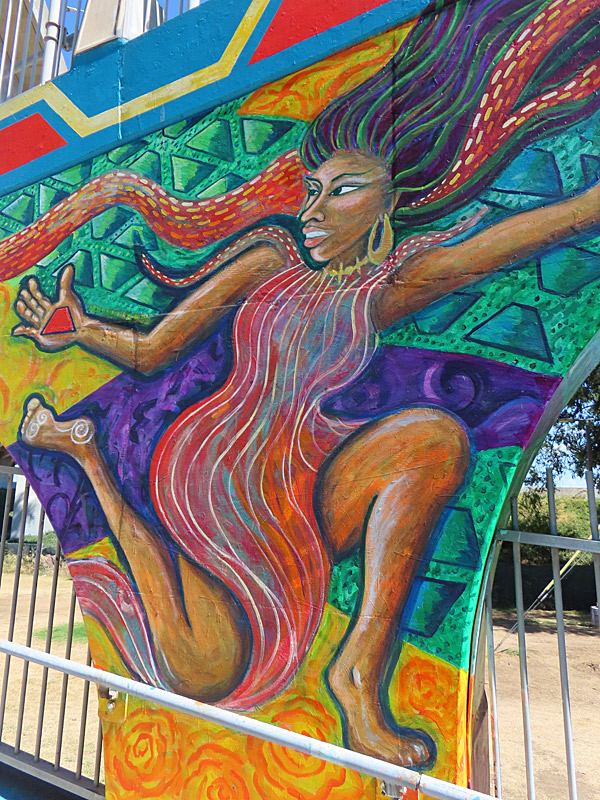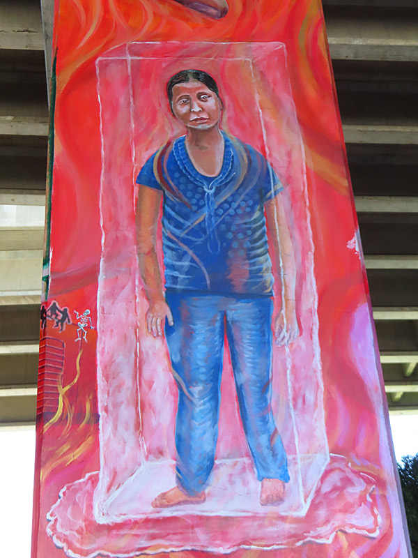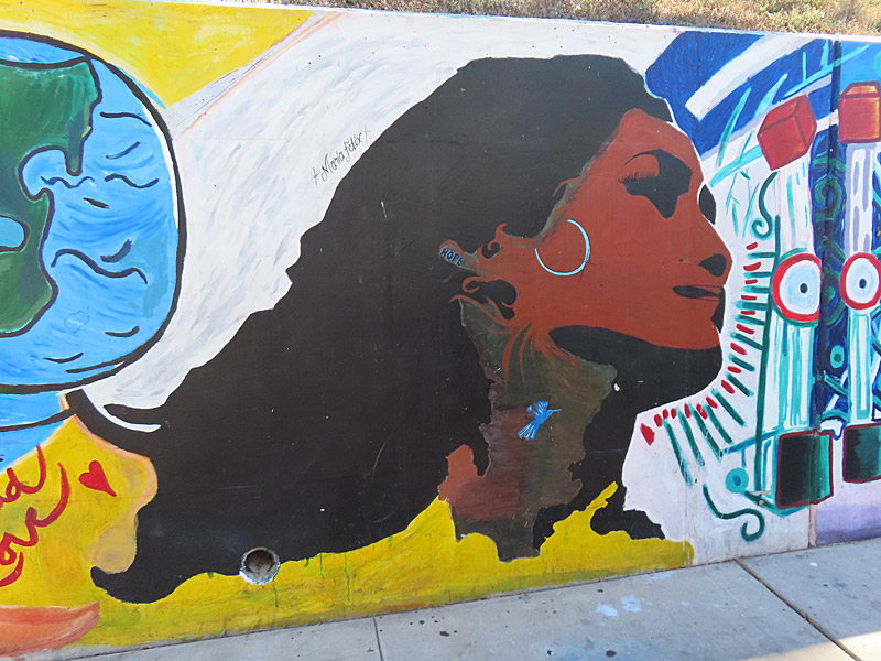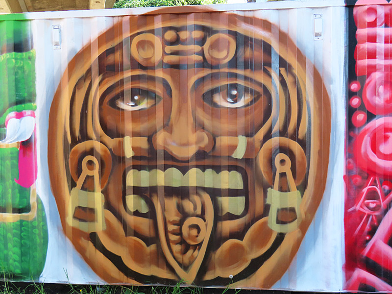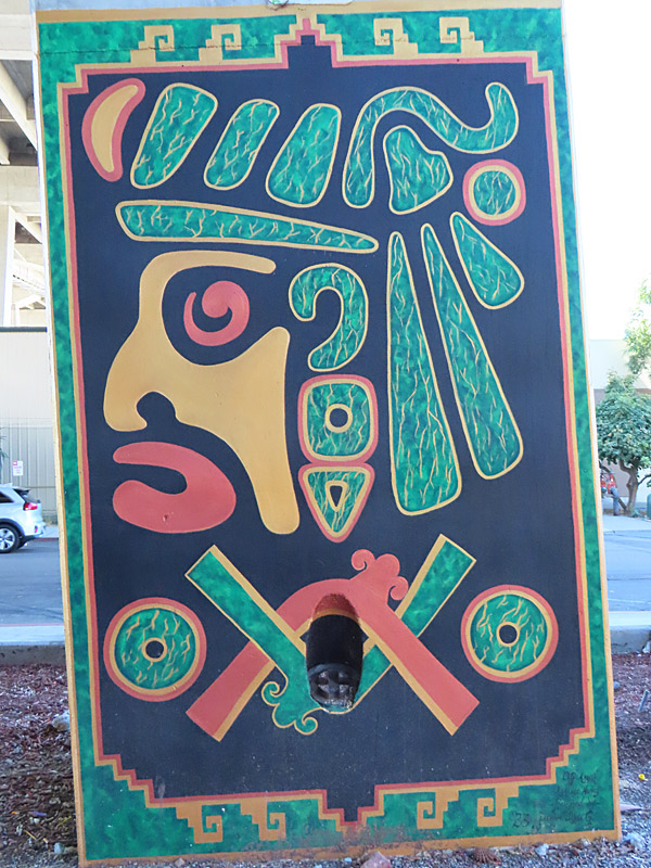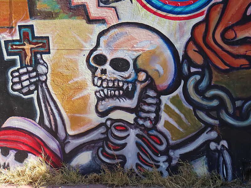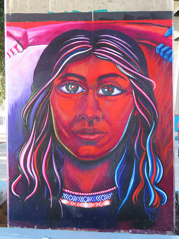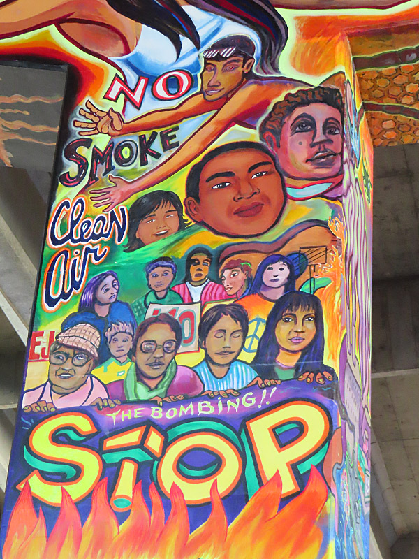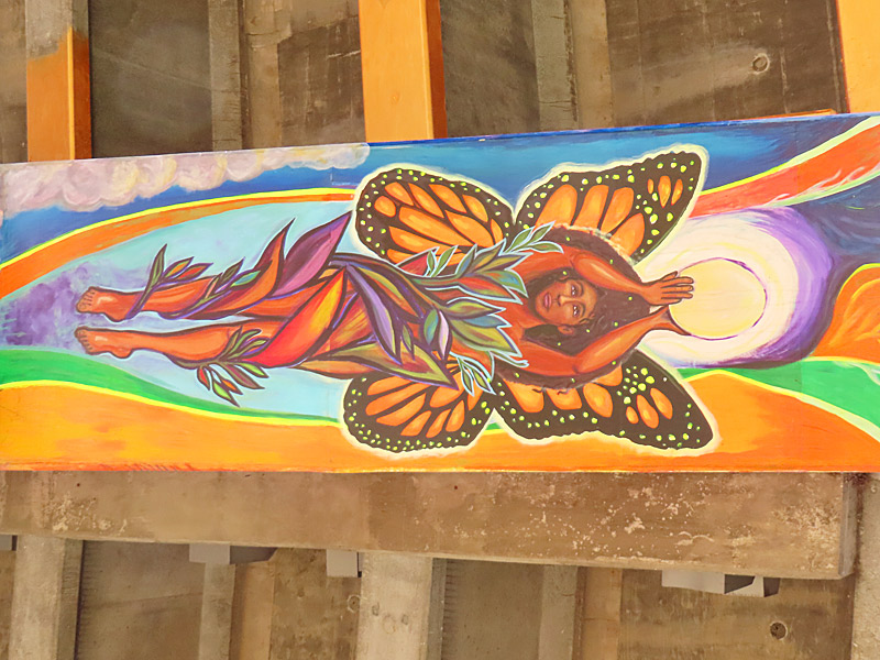 Most of the murals are painted on the infrastructure of a major highway interchange where Interstate 5 meets the road to the Balboa Bridge. Because of that, many of the surfaces are not proper rectangles. It’s interesting to see how the artists work with some odd angles and bridge supports that often are not exactly vertical or horizontal. Some of the murals are even painted on the bottom of the highway – or the ceiling of the park depending on how you look at it.