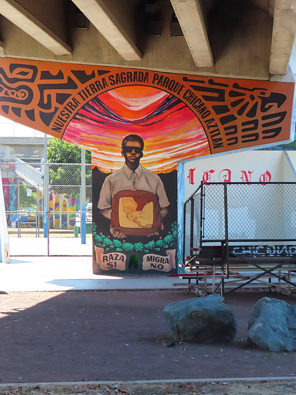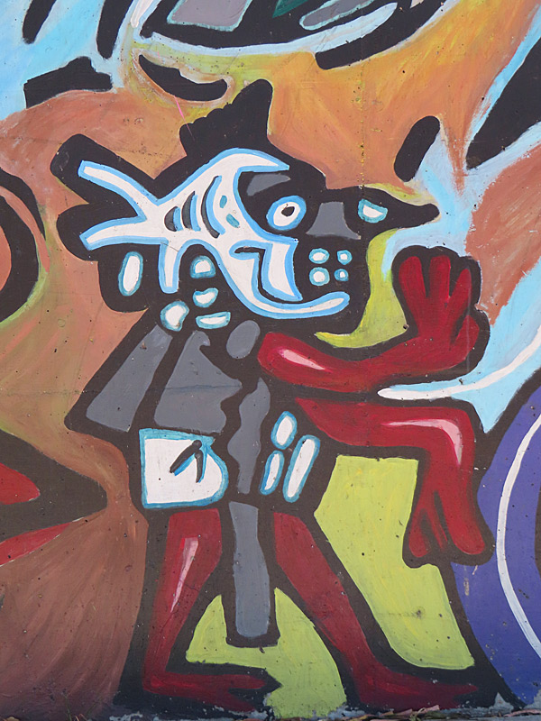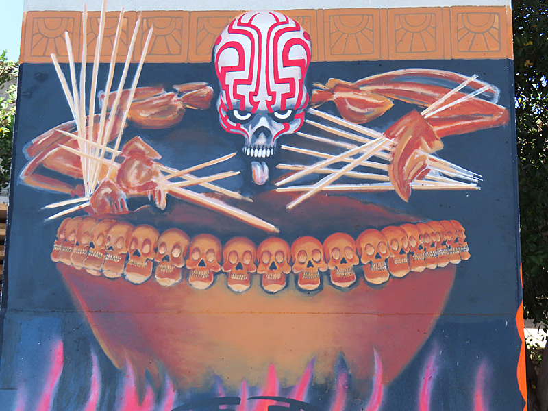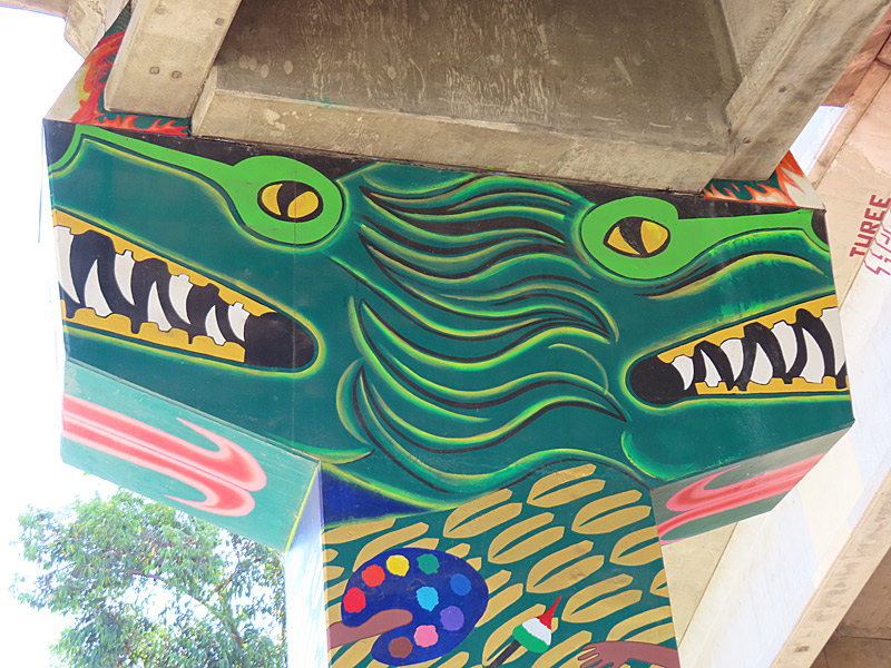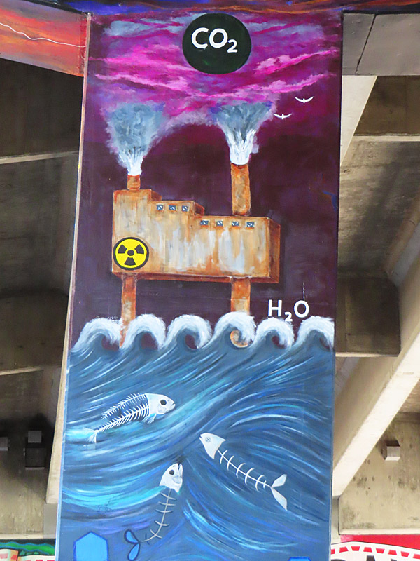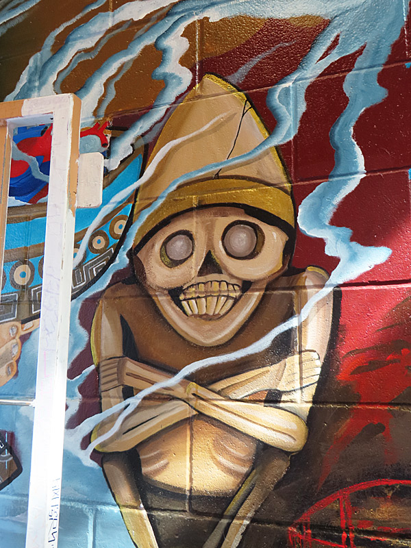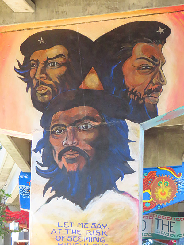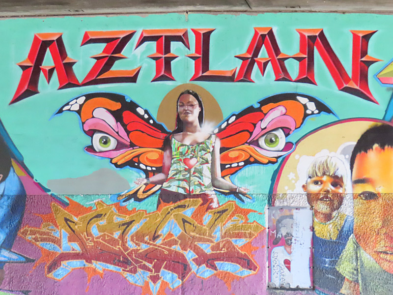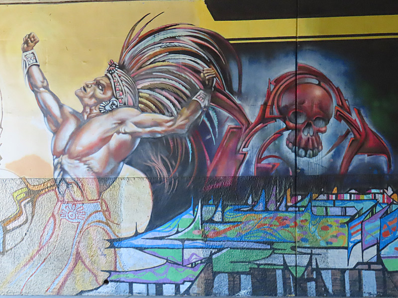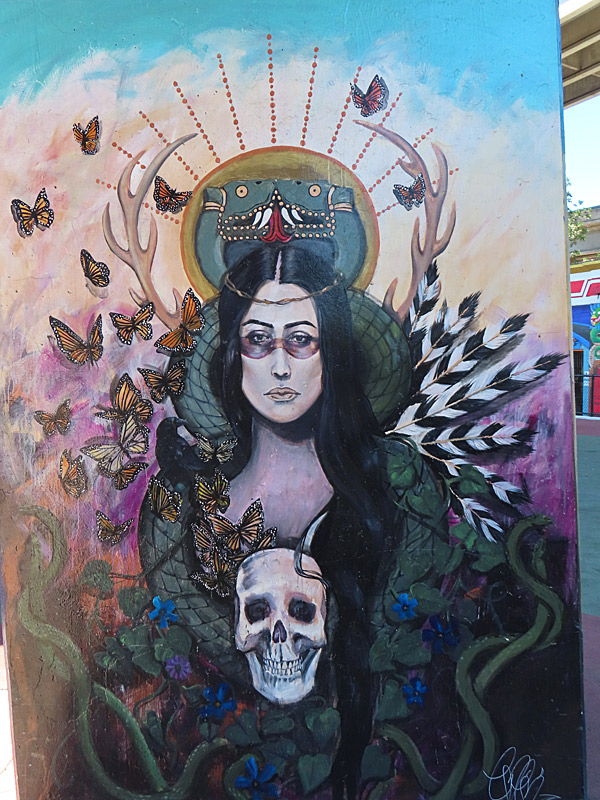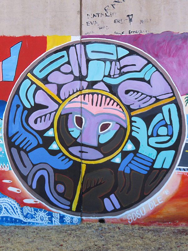 Most of the murals are painted on the infrastructure of a major highway interchange where Interstate 5 meets the road to the Balboa Bridge. Because of that, many of the surfaces are not proper rectangles. It’s interesting to see how the artists work with some odd angles and bridge supports that often are not exactly vertical or horizontal. Some of the murals are even painted on the bottom of the highway – or the ceiling of the park depending on how you look at it.