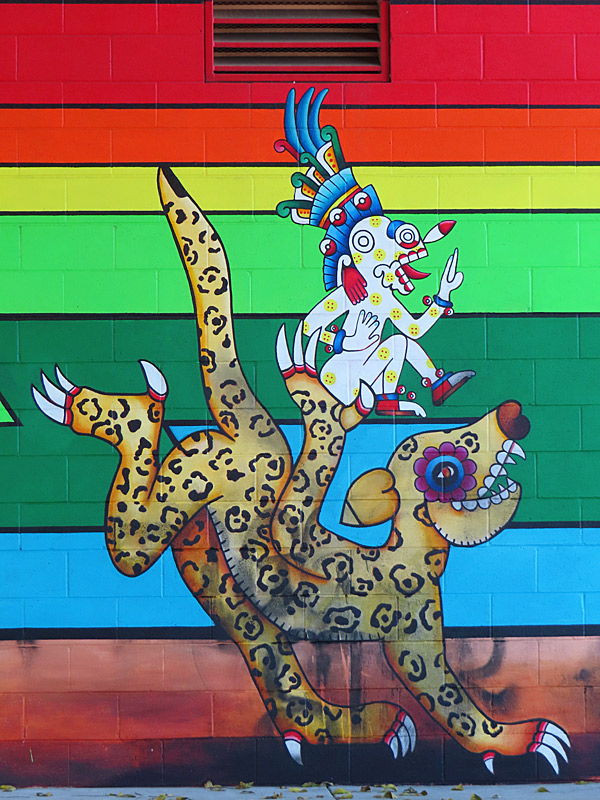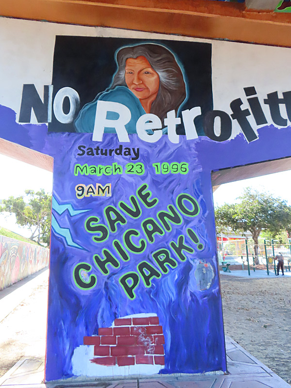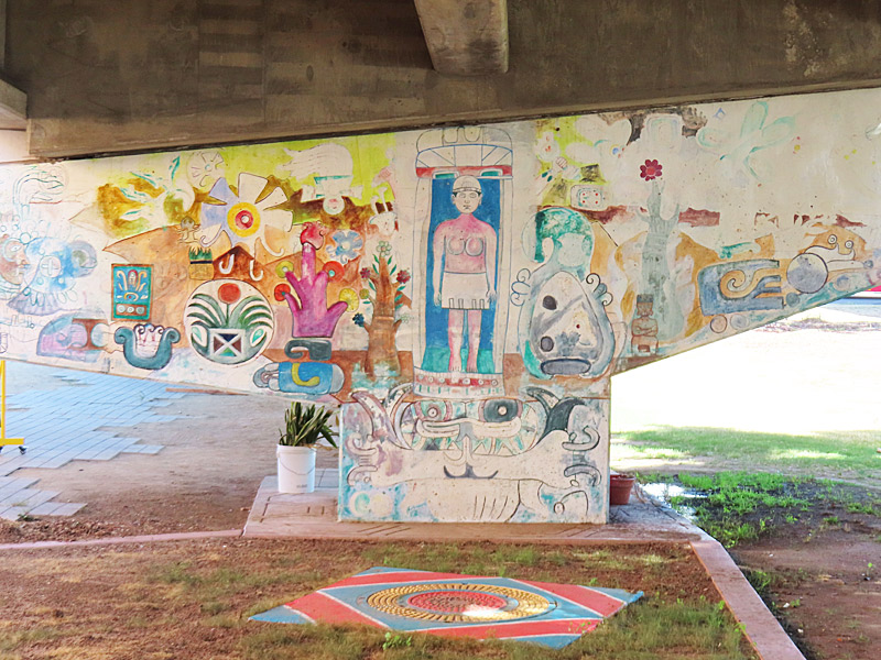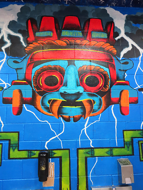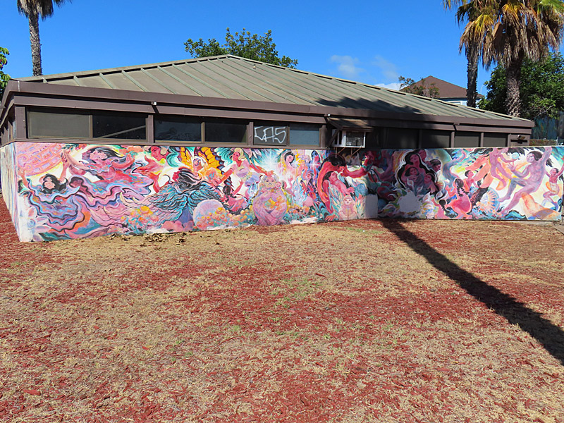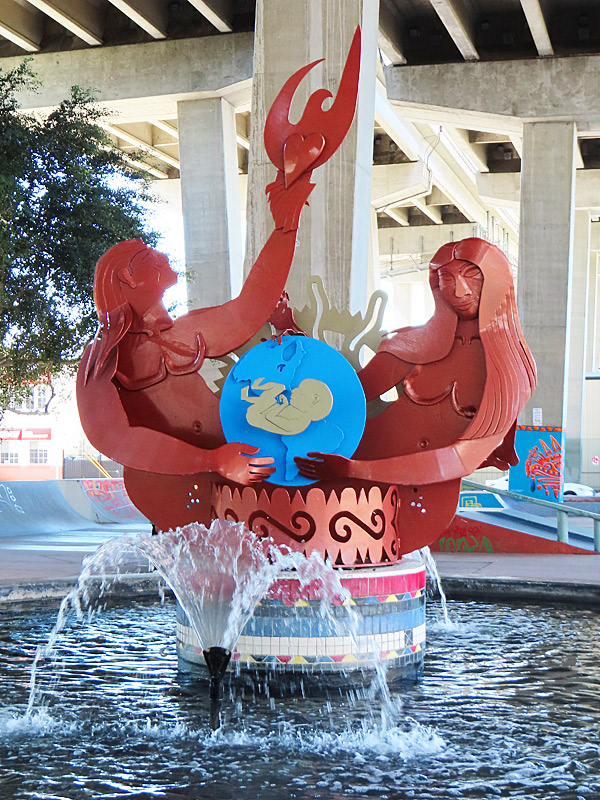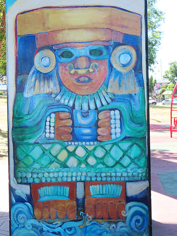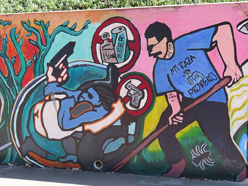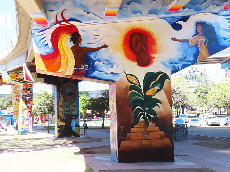 There is a parking area at the park, a few places to sit, a fountain, a small playground for kids and restrooms (even the restrooms have murals). There are also some neighborhood restaurants within walking distance.