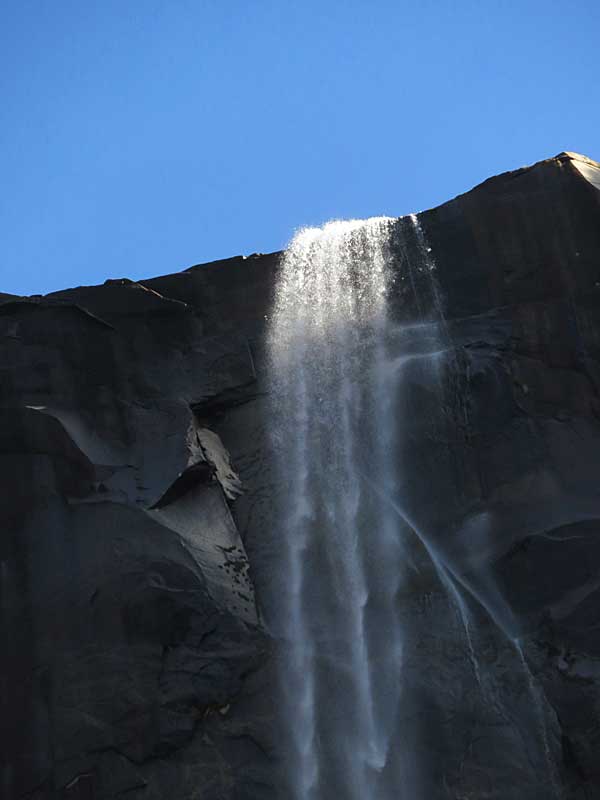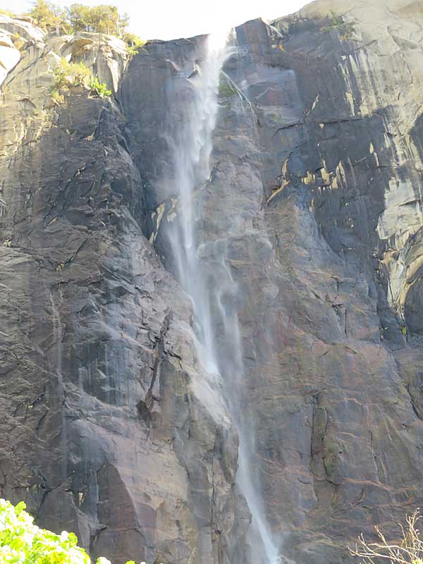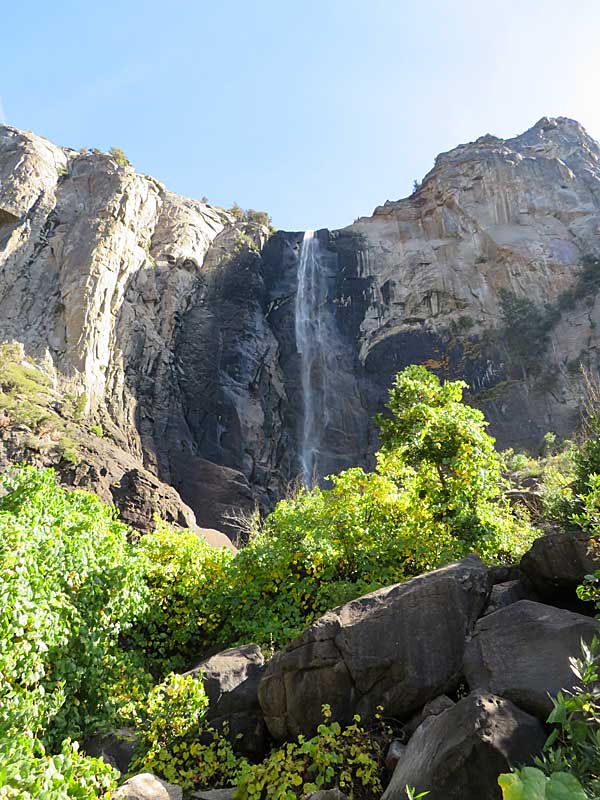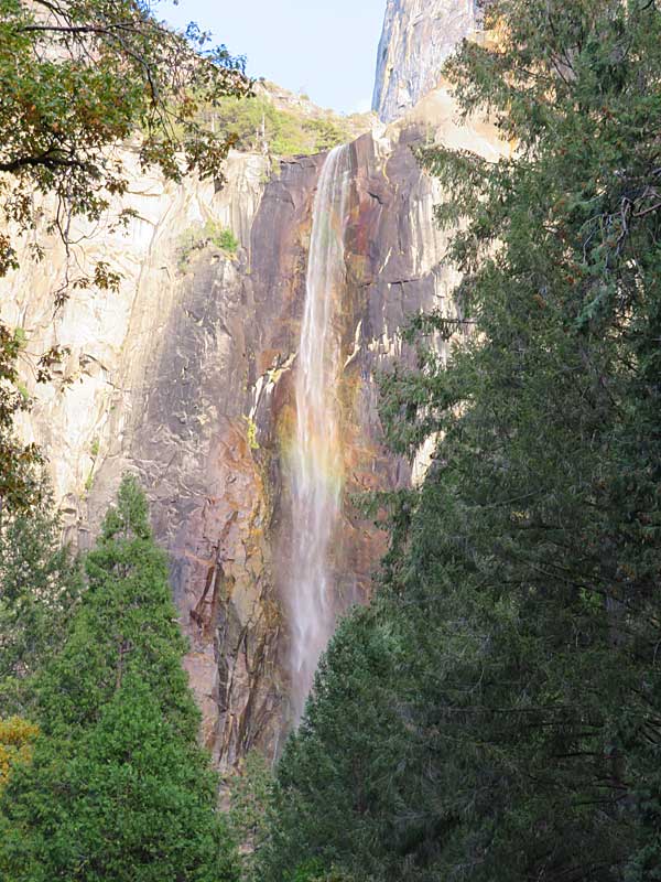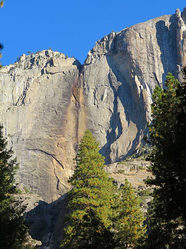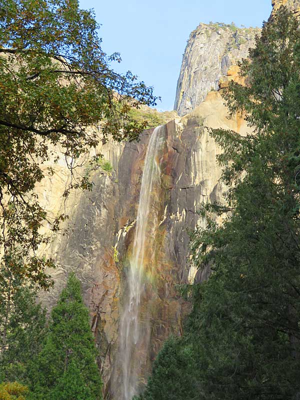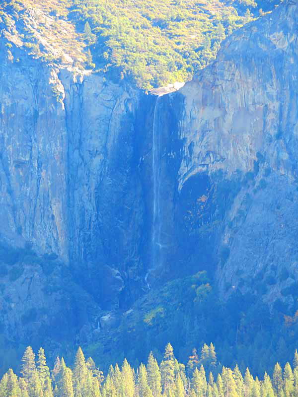 Bridal Veil Falls is brought to light by full sunlight by late afternoon. Even at the end of autumn when the water levels in Yosemite Falls are lower, it is a an impressive sight.