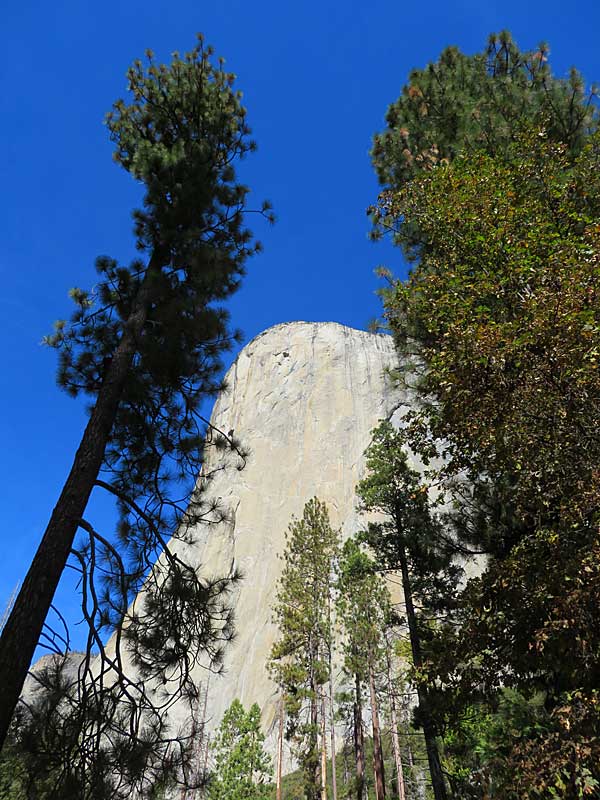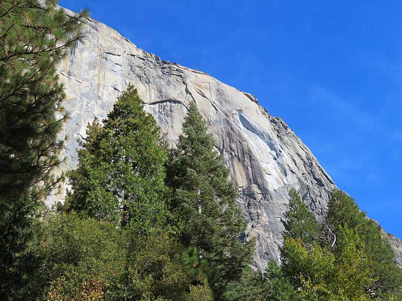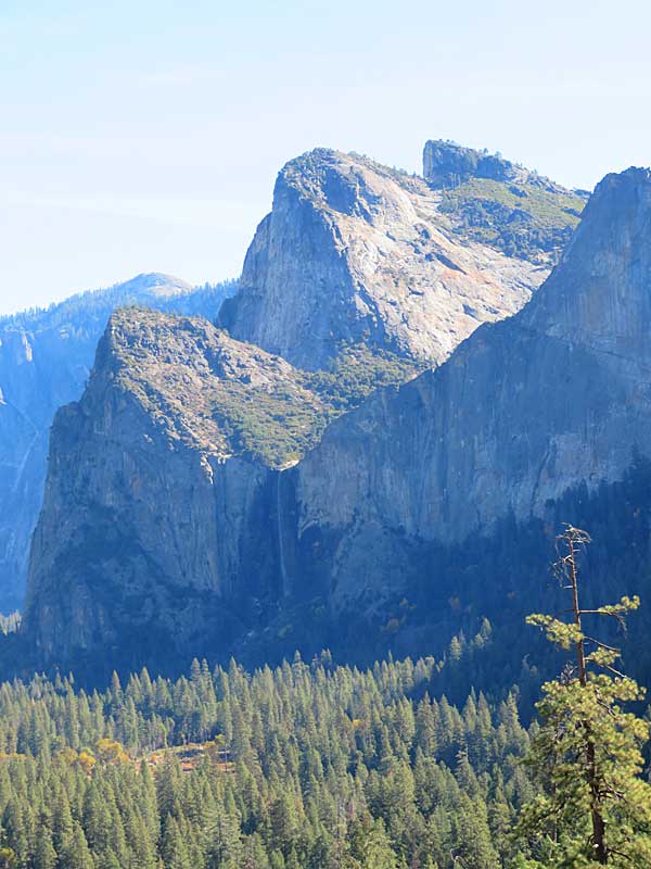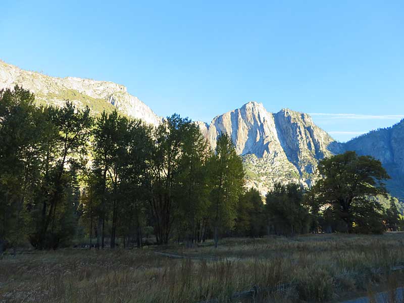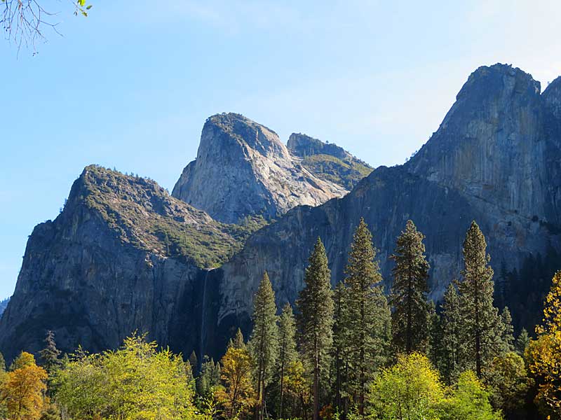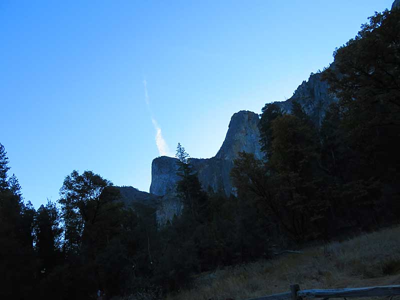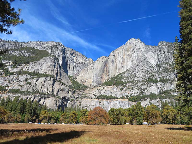 Bridal Veil Falls is brought to light by full sunlight by late afternoon. Even at the end of autumn when the water levels in Yosemite Falls are lower, it is a an impressive sight.