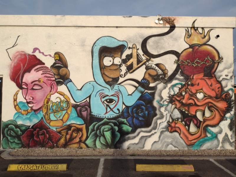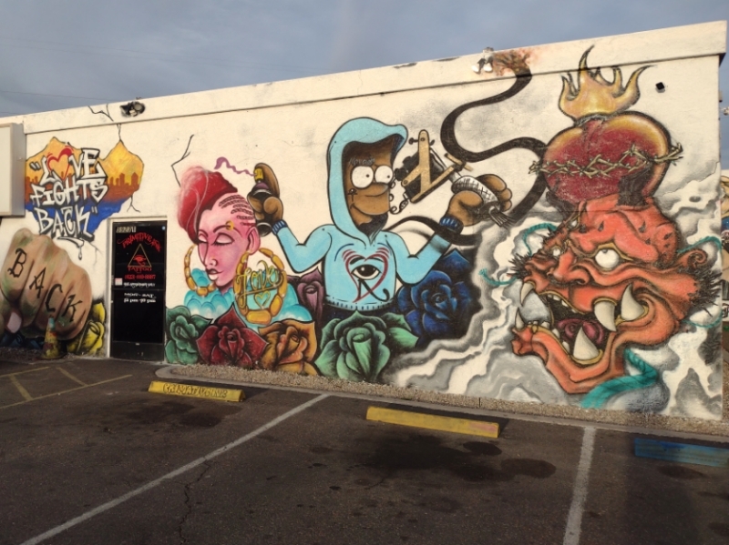 One of the “Love Fights Back” murals at Pr1mitive Ink tattoo shop in Glendale, Arizona. This art is near the front door.