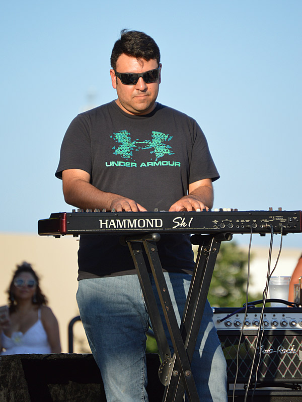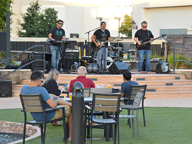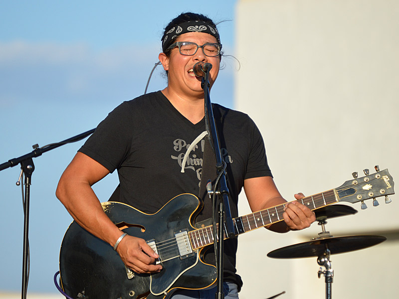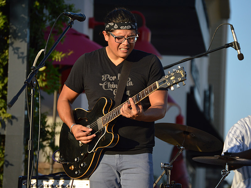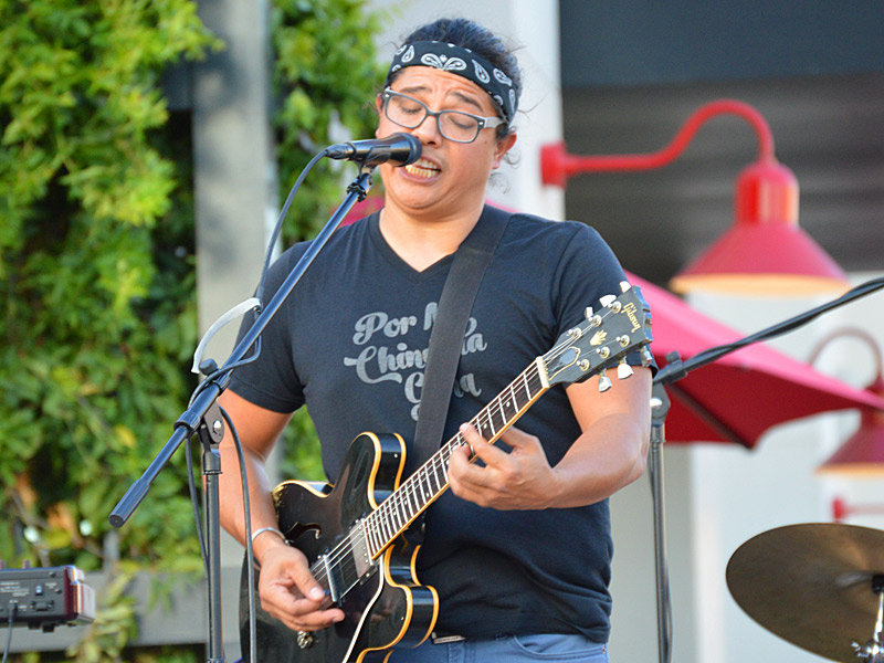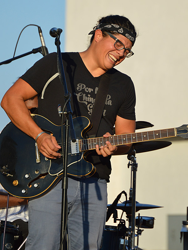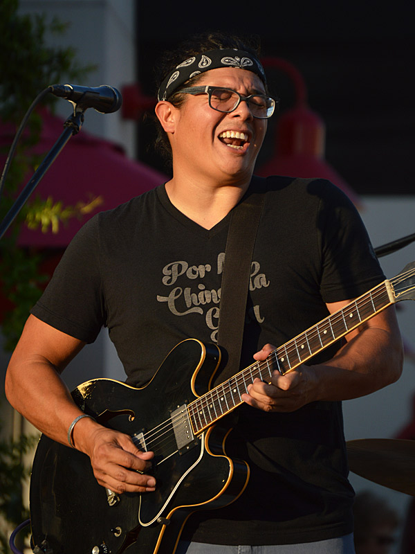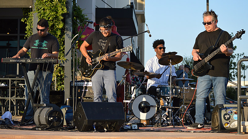 The Chris Cuevas Project with some sunset blues. – photo by Joe AlexanderThe Chris Cuevas Project played as the setting sun lit up Commons Park at the Rim on San Antonio’s north side on Wednesday, Aug. 2, 2023.
