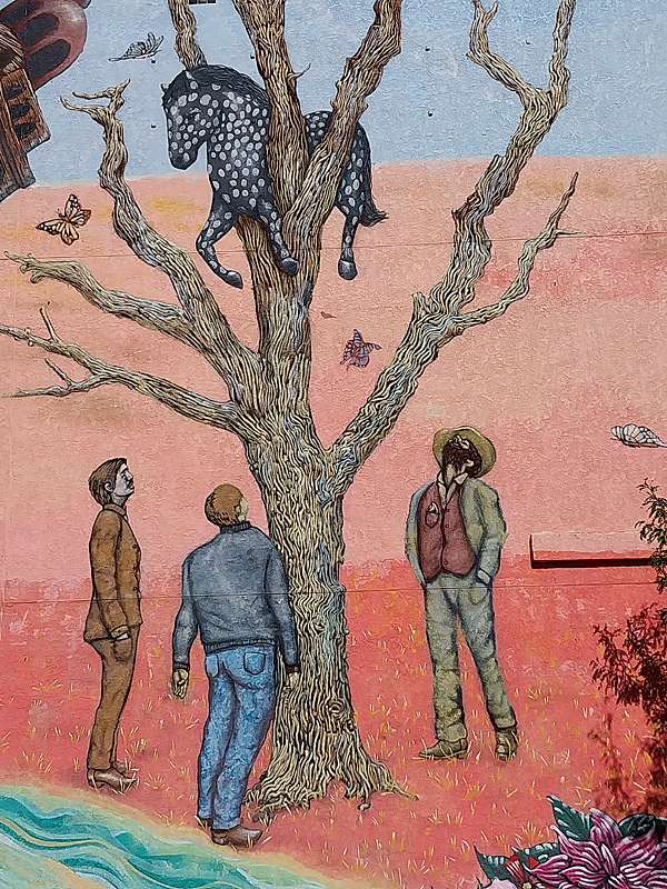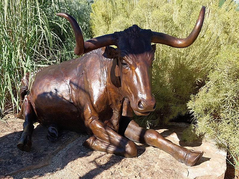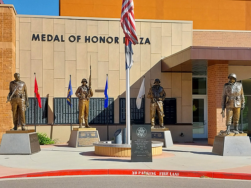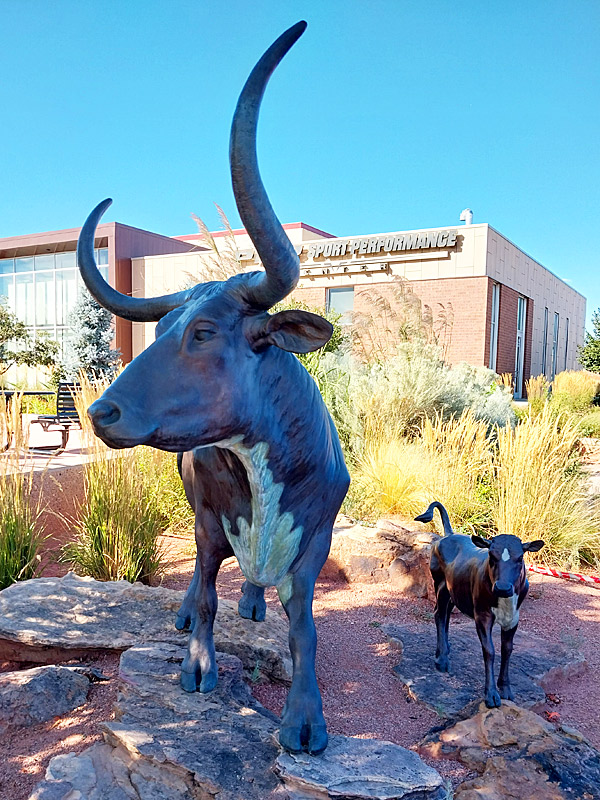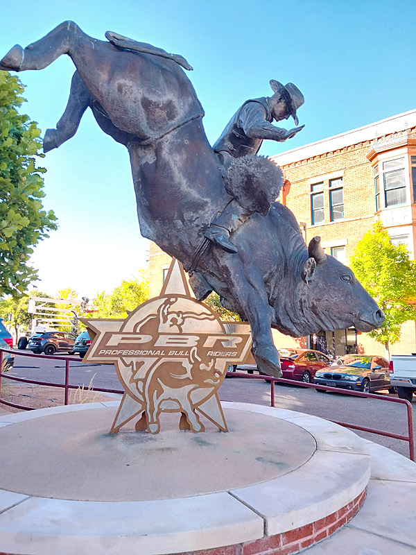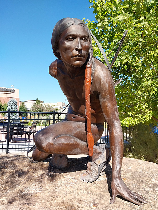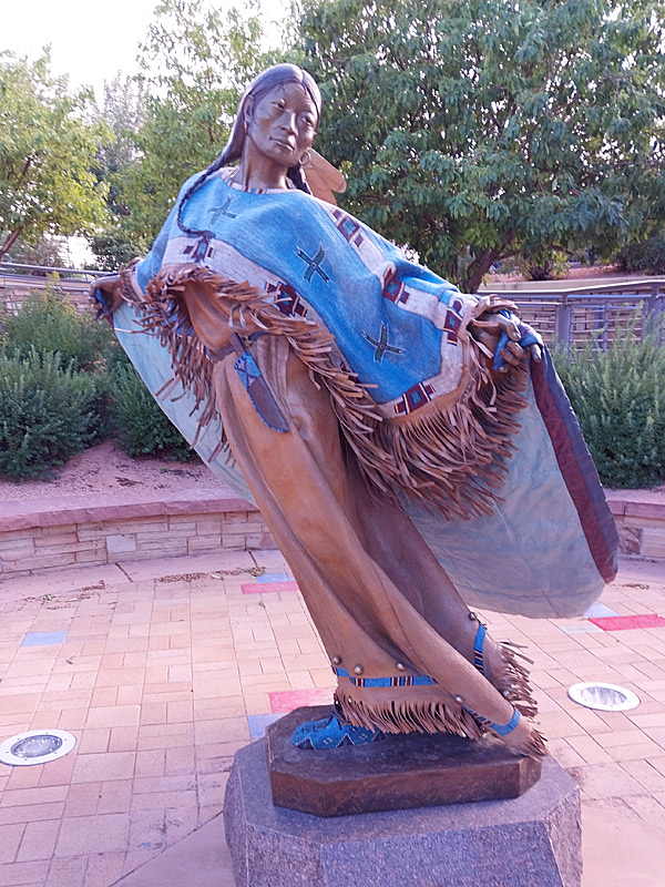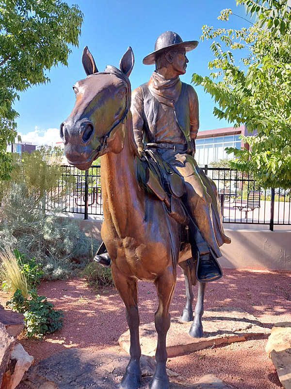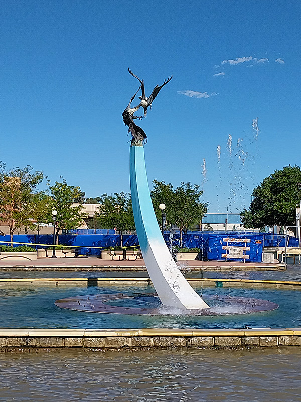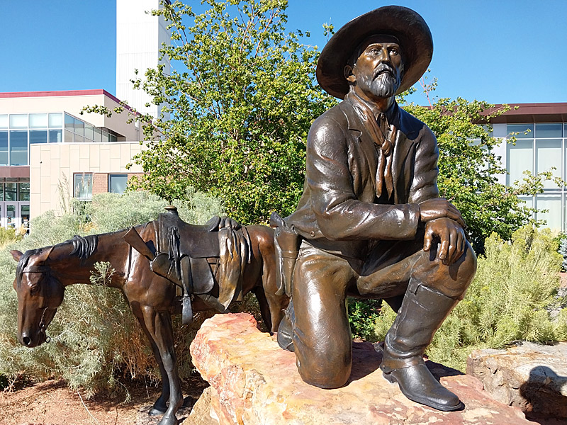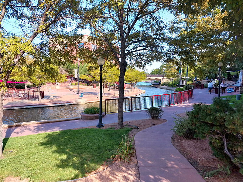 The Pueblo Riverwalk area includes old-west themed sculptures as well as restaurants next to wide sidewalks bordering the Arkansas River.