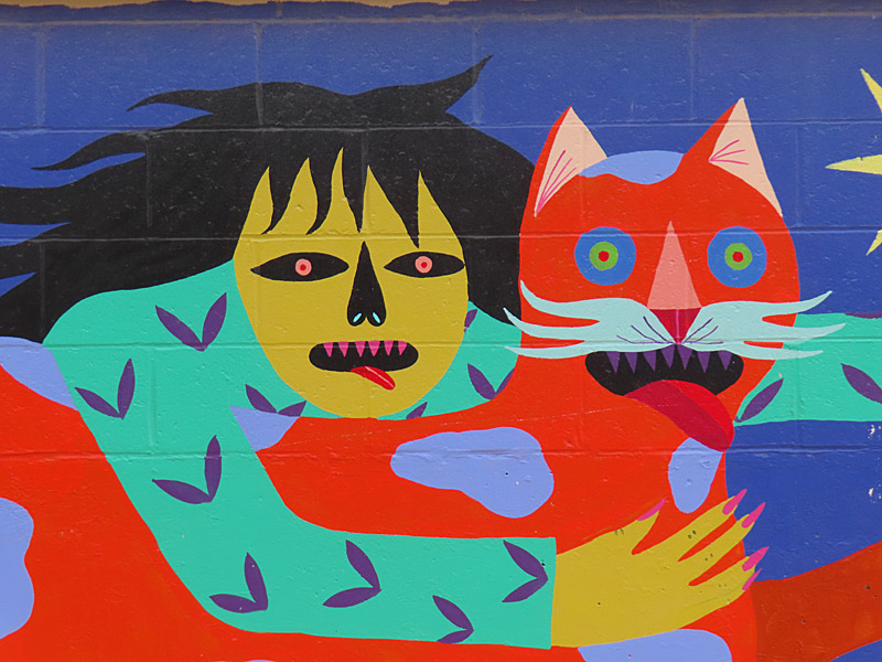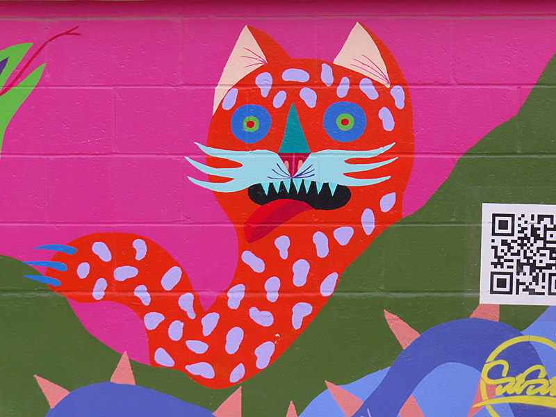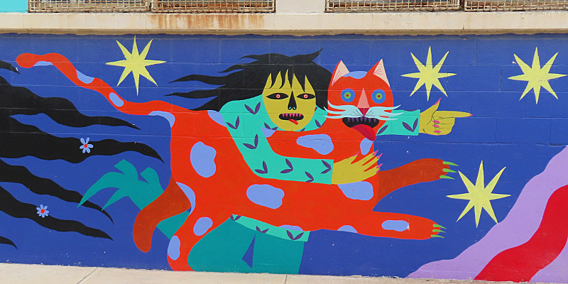 One of three cats in this Angela Fox mural located north of the main downtown San Antonio tourist area.This is another long mural behind the KLRN building on the corner of Broadway and McCullough – on the northwest corner of the building. The mural faces Avenue B and the parking lot of the CPS Headquarters.