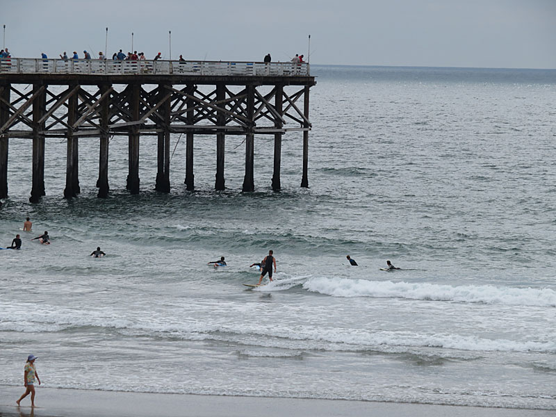 Crystal Pier begins where Garnet Avenue ends in Pacific Beach in San Diego, California. You can find surfers just north of the pier almost all the time.